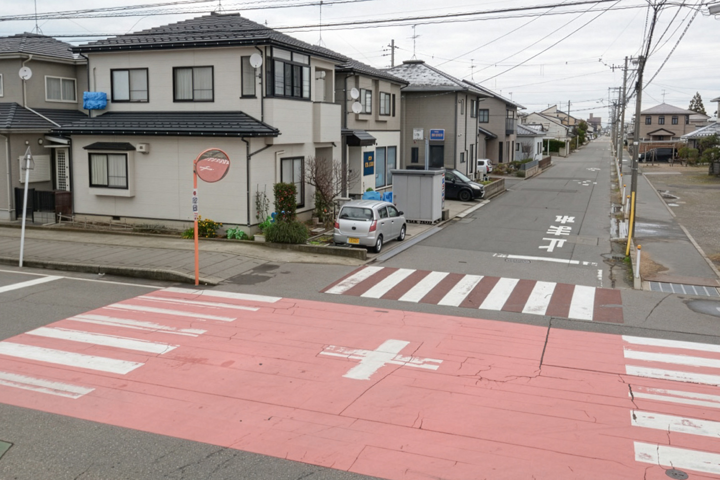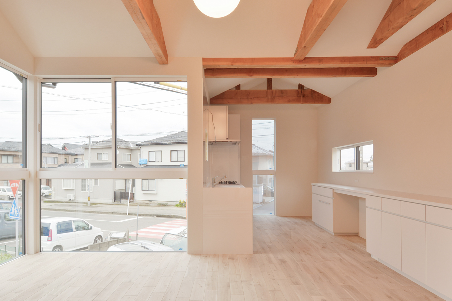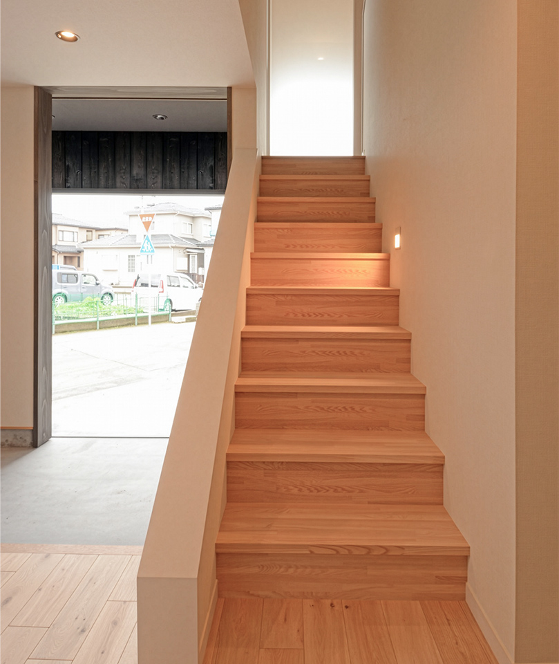築20年の建物は、構造補強、断熱改修、周辺環境への対応によって、二世帯が30年先も安心して快適に暮らすことができる建物となった。1階には親世帯、2階には子世帯の生活スペースが配置され、二世帯を繋ぐスキップフロアのLDKが二世帯を程よい距離で繋いでいる。建物の正面が北東側に伸びる道路とほぼ垂直に交わっており、建物が「ここに建っている」と主張しているよう。 さらにファサードに縦に1本入れたラインによって、その感覚はさらに高まる。