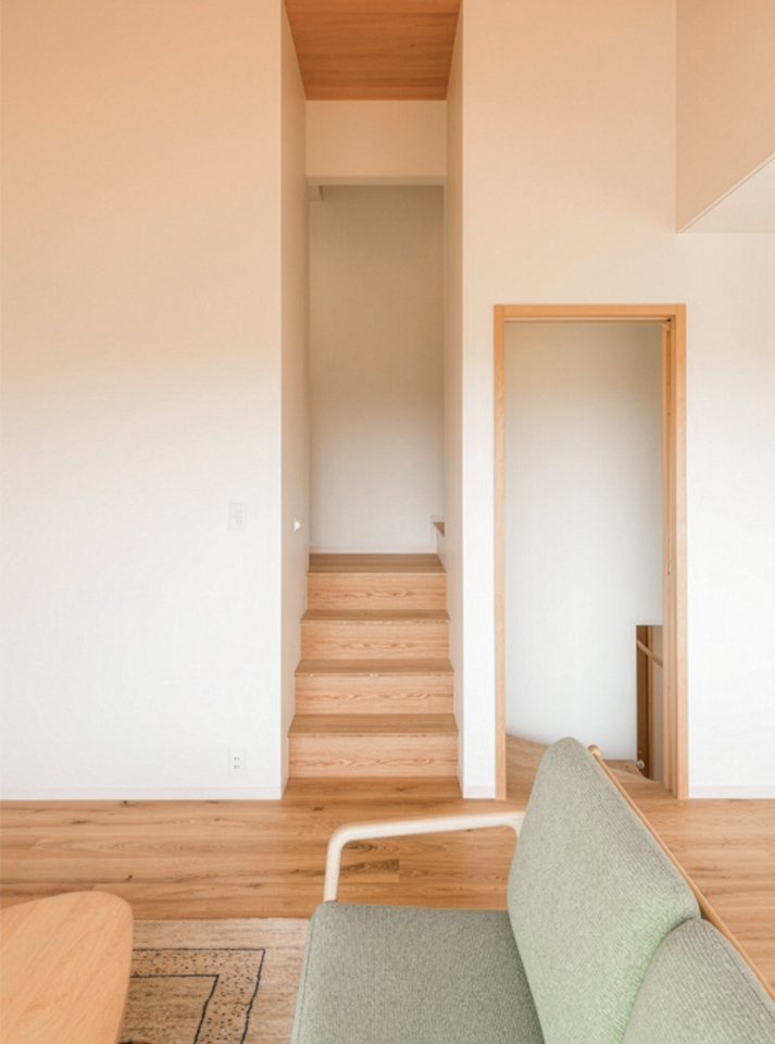 1階は主寝室と水廻り、2階は子供室、その間にLDKがあり、それぞれの階で異なる空間性を持たせている。個々のスペースの間に家族が集まるスペースを挟むことで、個々の空間を自立させつつ、コミュニケーションに配慮した生活空間となった。