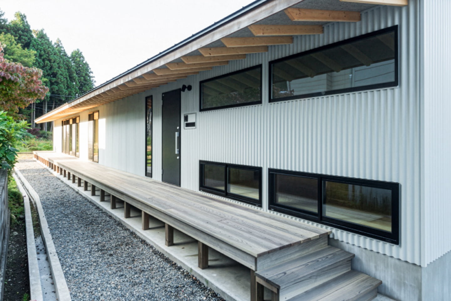 大きな屋根に守られているような外観は、毎年の積雪を考慮し、導かれた形だ。これは“落雪式屋根”という、雪下ろしの必要がない屋根形状を採用し、冬の負担軽減を図ったためである。