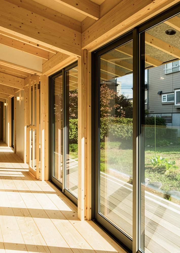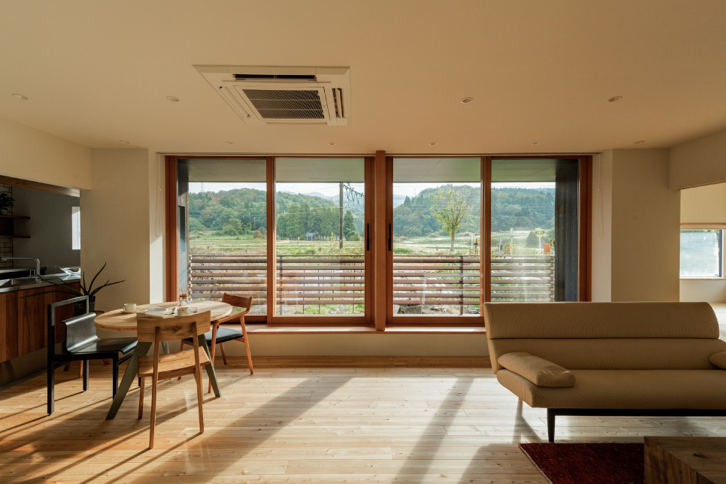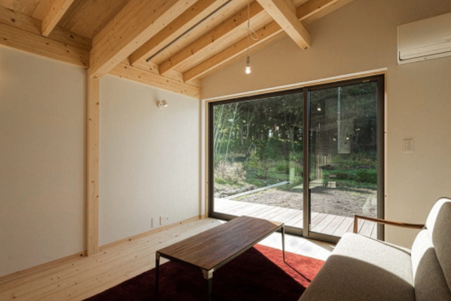 LDKと外とを繋げるウッドデッキは建物に入れ込み、屋根を掛けた。これにより雪との合間が保たれ、東側の雄大な自然の景色に向けて大きな開口を設けることができた。また、基礎を通常よりも高く設定することで、ある程度雪が積もっても雪に外との繋がりを遮られることのない、明るい室内を作り出した。