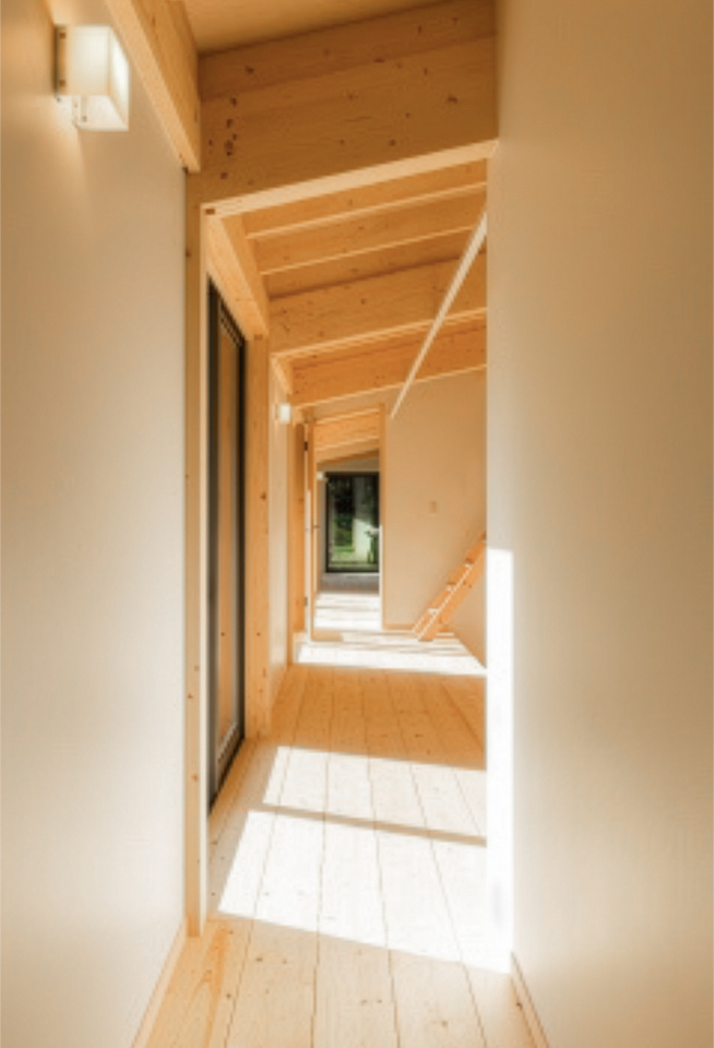 天井は小屋組表しにすることで、小屋組の建築的な美しさや力強さを見ることができる。また、一定の間隔で架けられた登り梁が長く続く廊下に軽快なリズム感をもたらしている。