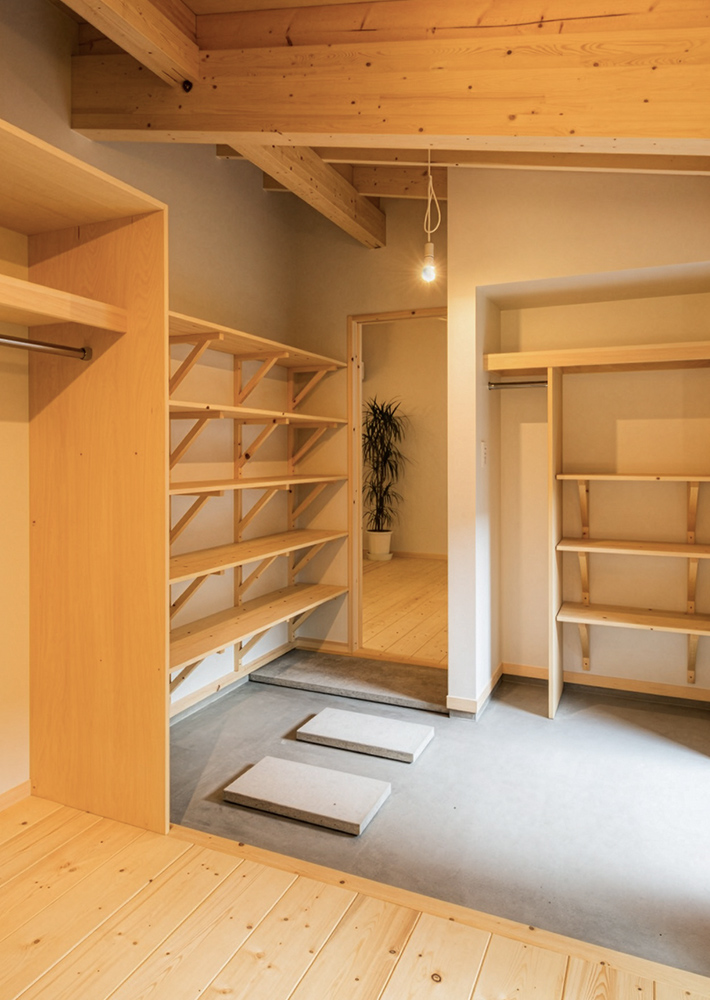 主寝室は玄関を挟んで廊下の反対側に設けられている。一日の終わりを過ごす部屋は、LDKとは対照的な落ち着きのある「はなれ」のような空間にした。
