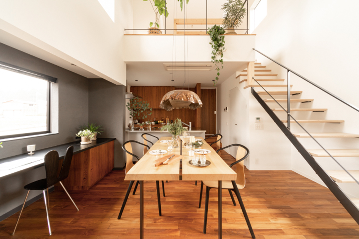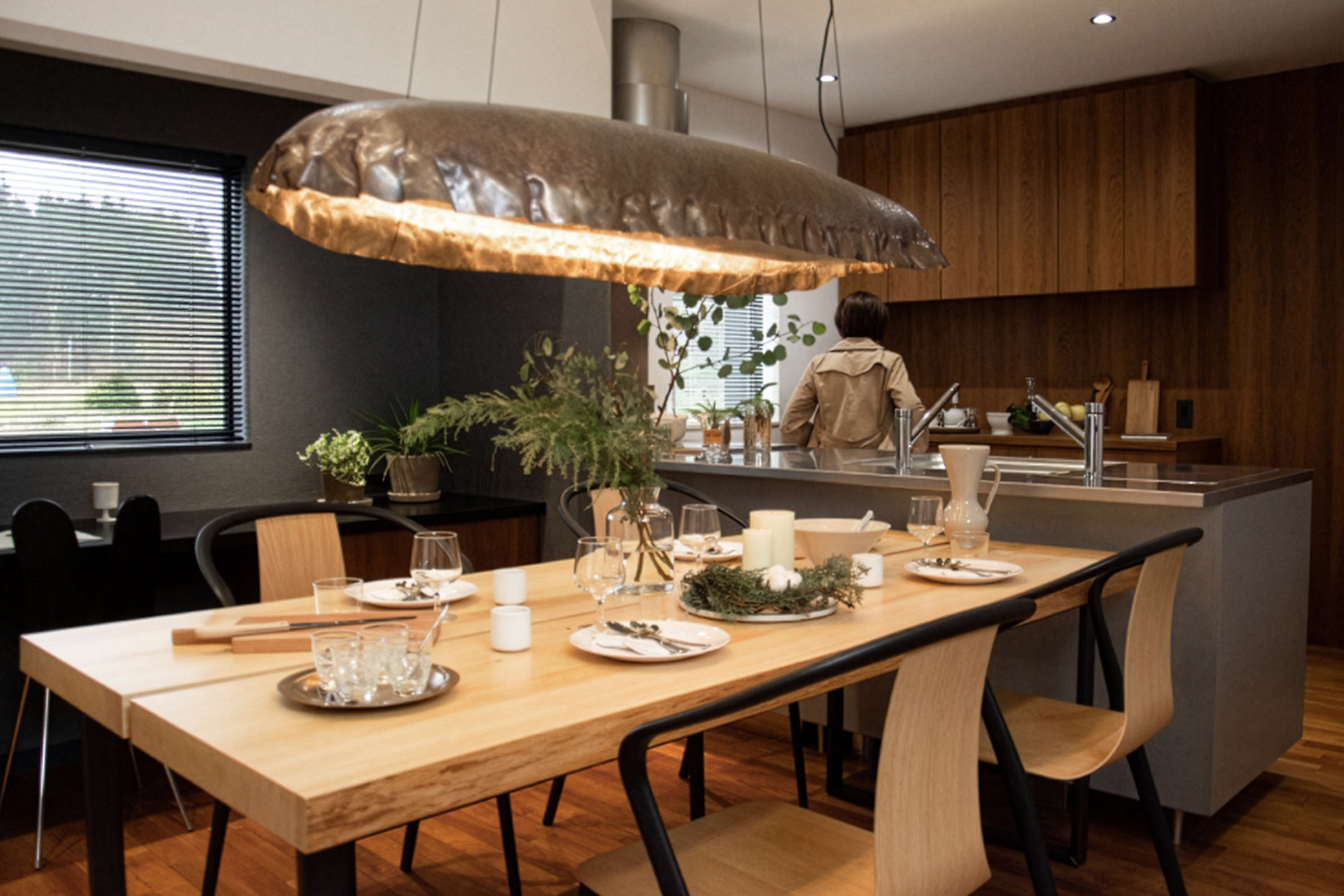 3.5mほどの高さから吊るされたランプシェード。ダイニングテーブルを包みこむように設置されたシェードは、鎚起銅器職人 大橋保隆さんの手によって1枚の銅板から作られたもの。直線で構成される建築の中、宙に浮かぶような有機的なフォルムが印象的で、直線と曲線の対比が空間全体のアクセントになっているのがよく分かる。「今までは手の中に収まるサイズのものを作ることが中心でした。それが自身の考える職人としてのものづくりだと思っていましたから。だから、話を頂いた時は手掛けたことのない大きさだけどできるかな?と、難しさと同時に面白さも感じました」。
