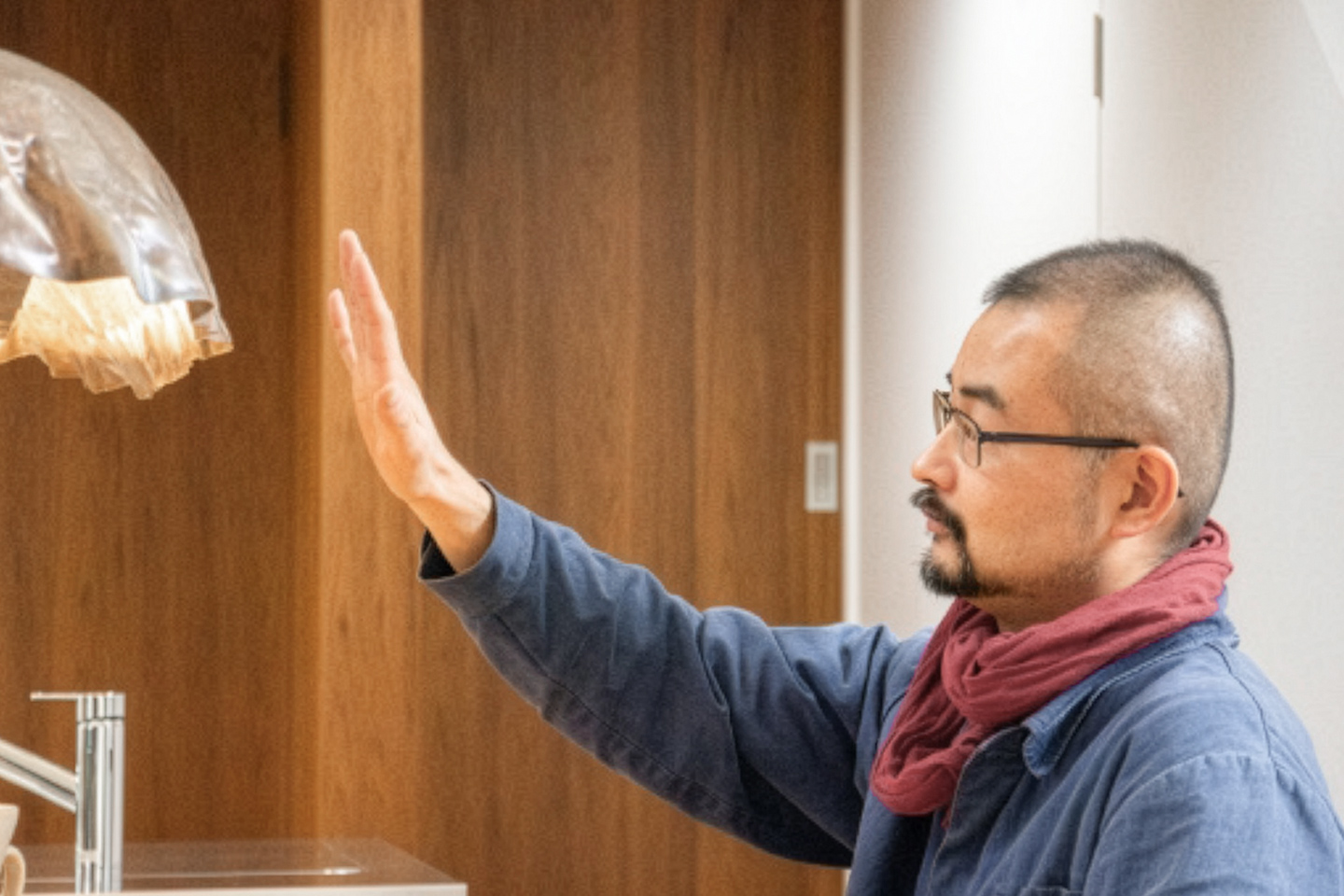 1枚の銅板を金鎚で打ち、形を起こして作り上げる鎚起銅器。鎚起銅器職人の大橋保隆さんは、⾃身の手掛ける器を通して200年以上続く伝統と技術を今に伝えています。今回、キューブデザイン初の試みとして、ランプシェードの製作を依頼しました。職人としての手技と作家としての表現について、大橋さんが製作を経て辿り着いた思いを伺いました。