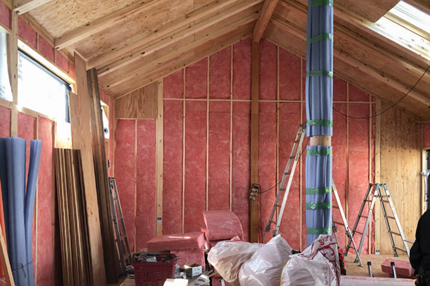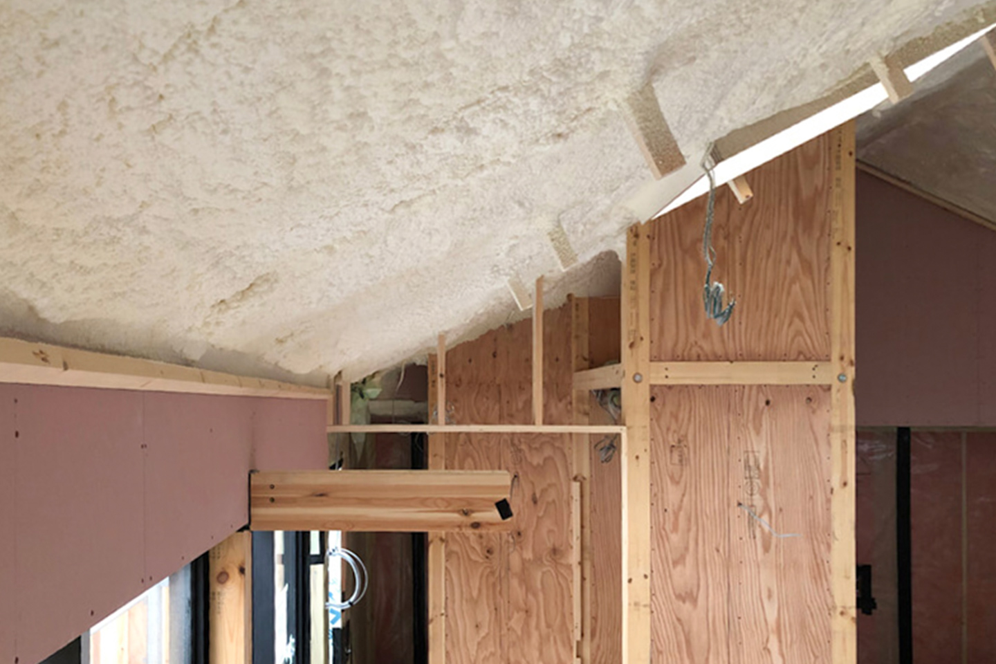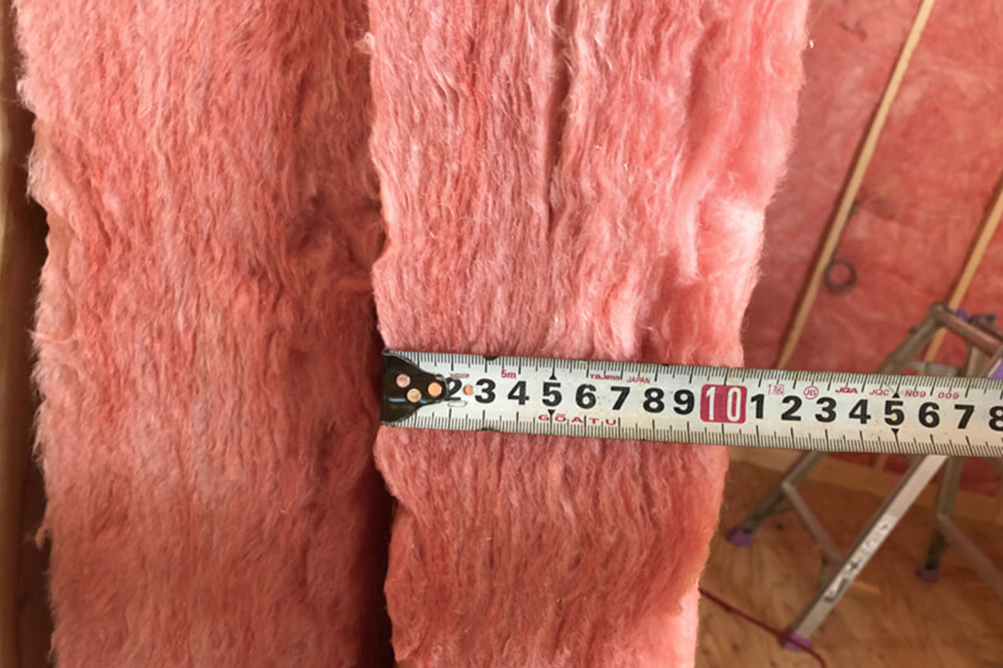 今回、断熱材は屋根、壁、床と、それぞれ異なる種類のものを使用しています。特に、壁の断熱材は建物の柱と柱の間を断熱材で埋める「内断熱」と、建物全体を断熱材で包み込む「外断熱」とを採用した「ダブル断熱工法」を採用しました。断熱性能は、使用する断熱材の種類や性能ももちろん大切ですが、壁内の結露などの不具合の防止や断熱性能を発揮するためにも、しっかりと施工をすることのほうが重要となります。