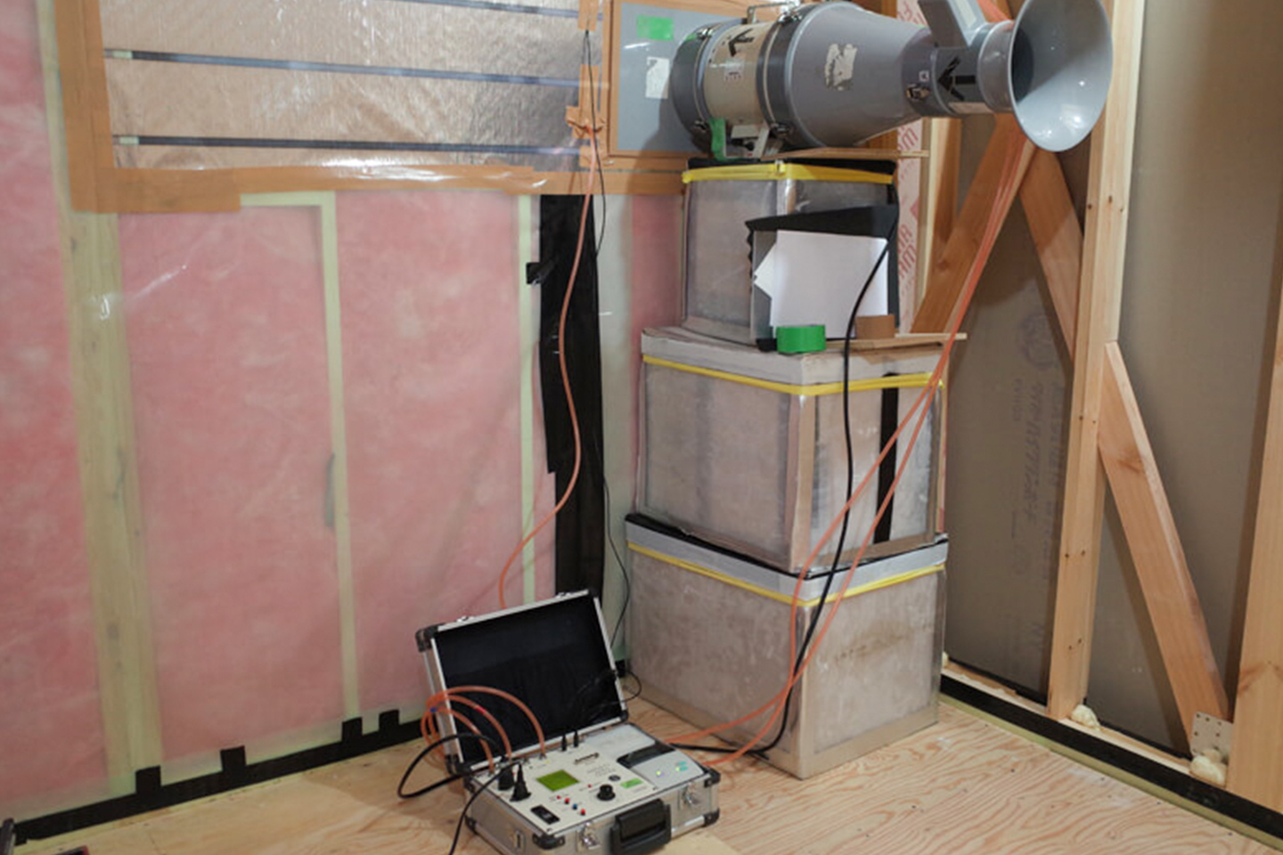 なお、この断熱性能をしっかりと発揮するためには、気密性能も重要になります。気密性能は、建物の隙間が少ないほど性能が高く、どんなに性能の高い断熱材や厚いものを使っても、隙間が大きければ外の空気が入り込んでしまい、断熱材が本来持っている性能を発揮できません。気密性能は「相当隙間面積・C値(㎠/㎡)」で表され、値が小さいほど隙間が少ないということになります。このC値に基準はありませんが、一般的に「1.0㎠/㎡以下で高気密住宅」という認識となります。そしてC値を測定するには「気密測定」という検査を行います。今回のプロジェクトでは、0.5㎠/㎡以下を目指して施工と気密測定を行い、0.4㎠/㎡をクリアしました。