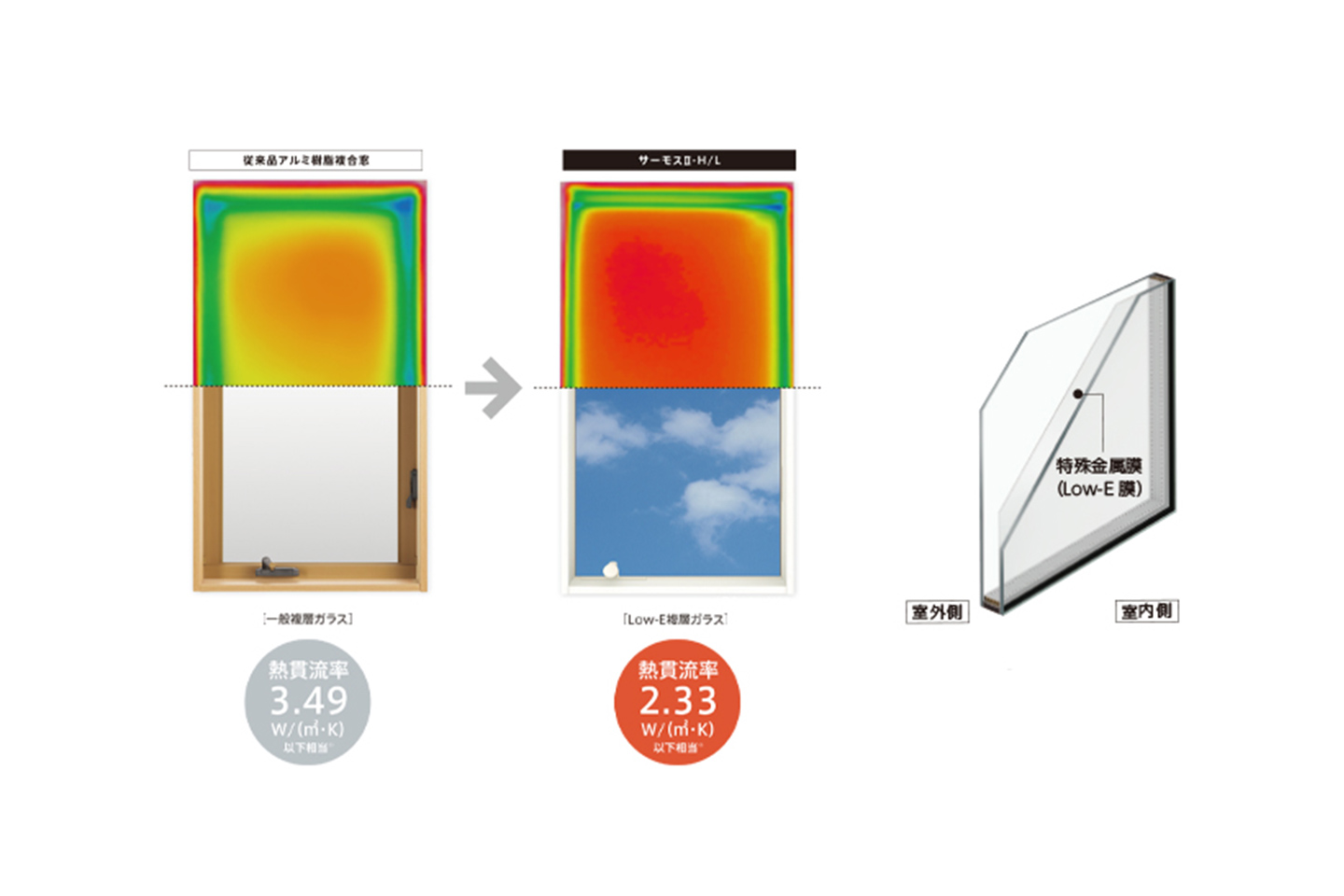 プロジェクトで使用した窓は、すべてLIXILの「サーモスL Low-E複層ガラス」のアルゴンガス入りのものです。サッシの外部に面する部分は、耐久性や意匠性に優れたアルミ、内部は断熱性や防露性に優れた樹脂を使用し、互いの長所を活かしたアルミと樹脂の複合サッシです。さらに、ガラスに特殊金属膜をコーティングさせることで優れた断熱性を有するLow-Eガラスを使用しています。ガラスとガラスの間には、アルゴンガスという不活性ガスが入っています。このアルゴンガスは「気体の断熱材」ともいわれ、空気よりも熱を伝えにくく、また、空気よりも比重が重いため複層ガラスの中空層で対流が起こるのを抑えて断熱効果を高めています。