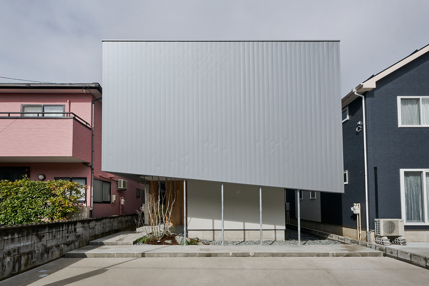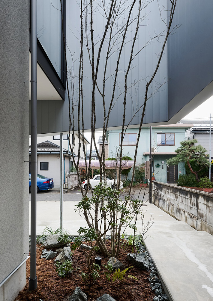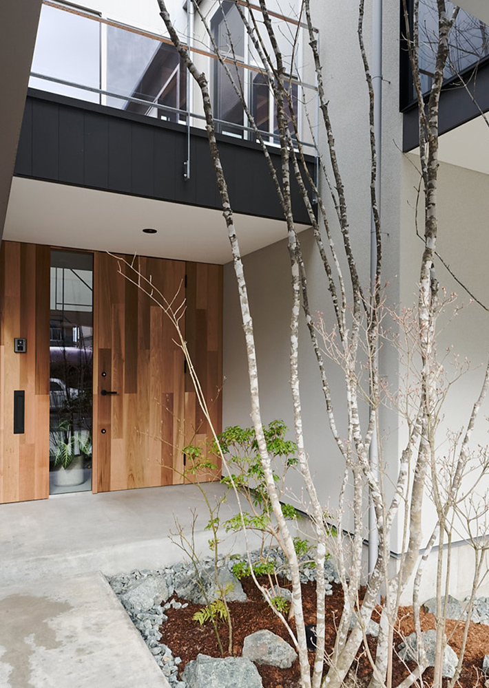 完全にプライバシーを確保するため、2階LDK部分はシルバーの帯で外壁を纏いました。両端の吹抜けは、リビングに程よく光や風を届け、アプローチに植えたアオダモもよく育ちます。吹き抜けを通るアプローチの先、玄関はレッドシダーの造作扉としました。