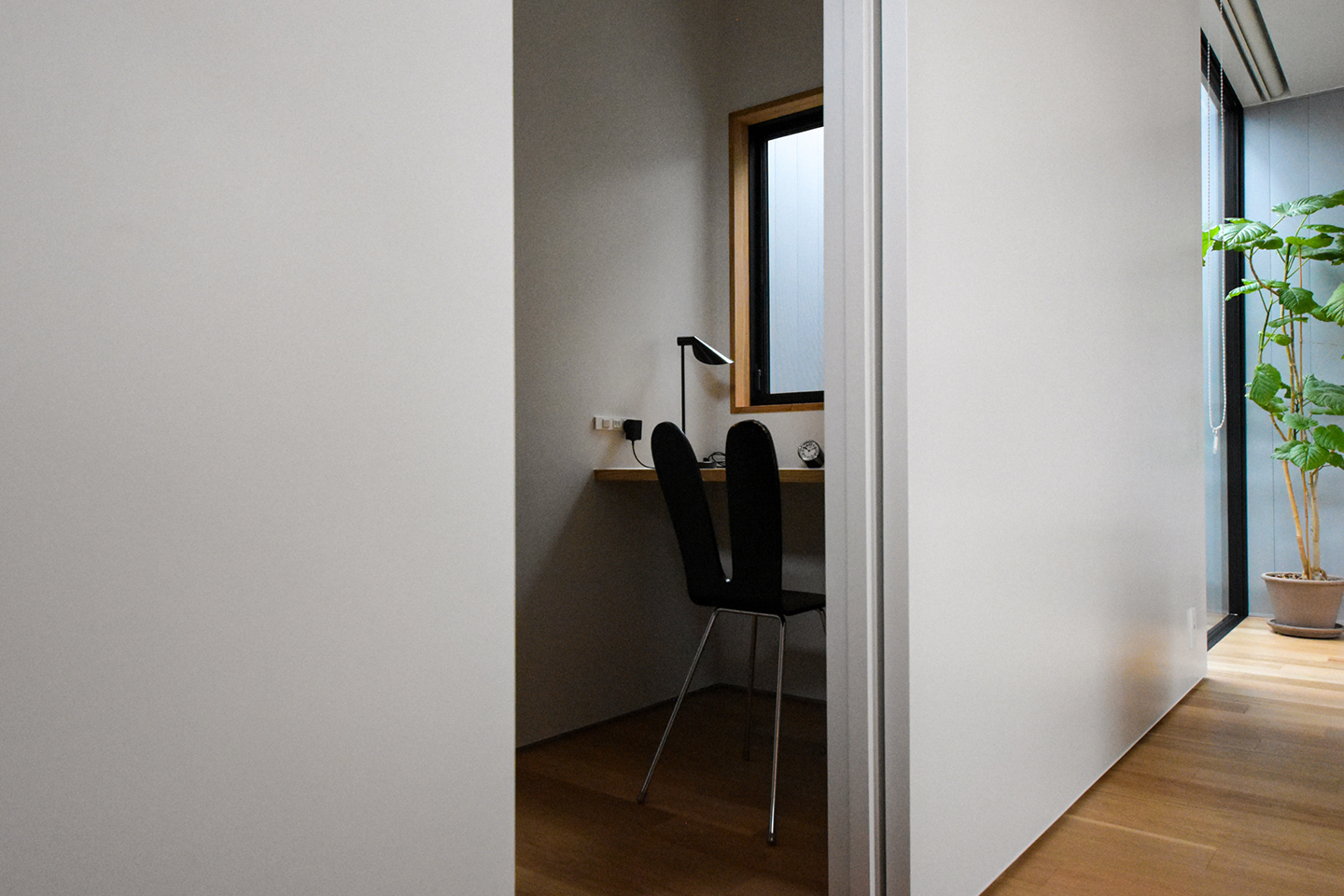 リビングに接した書斎は、2畳ほどの広さですが、背面に本棚を設け、作業に集中できる落ち着いた空間としています。