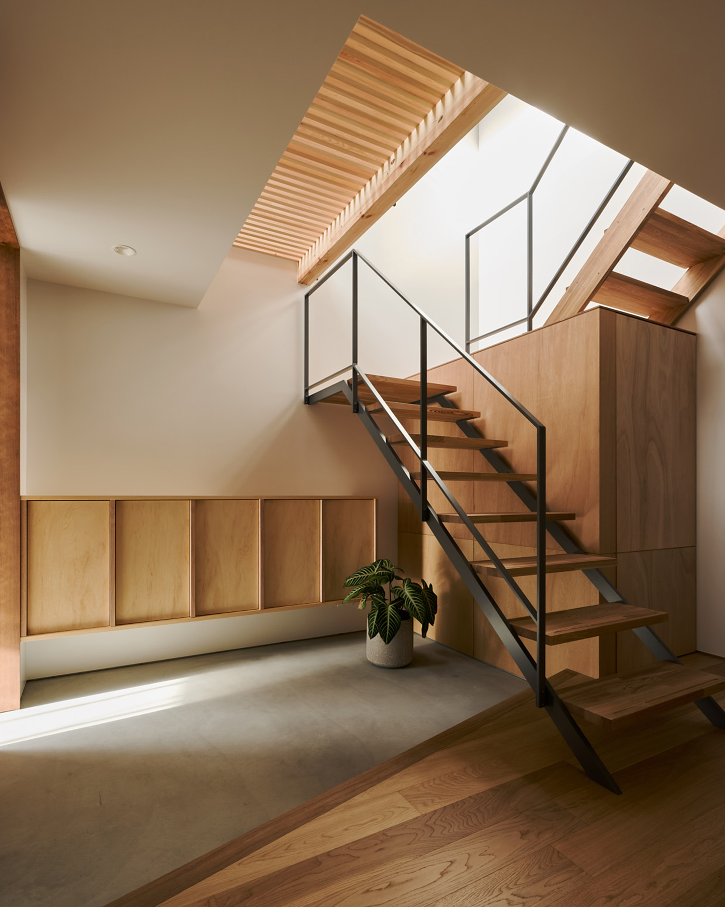 玄関ホールは約5畳の広さです。カウンタータイプのシューズキャビネットを採用し、下を浮かせることで、土間との繋がりをきれいに見せ、広い空間に感じるようにしています。 階段は、ササラの部分を出来るだけ薄くし、段板も後ろから飛び出ないように全体を前に持ち出すことで、階段の下をくぐった際に障害にならないようにしました。