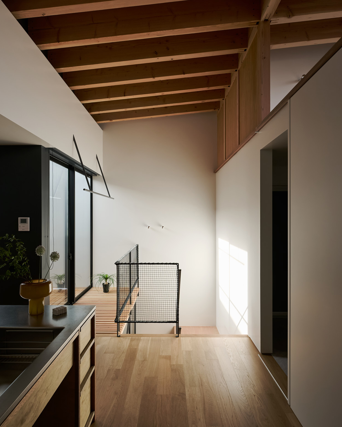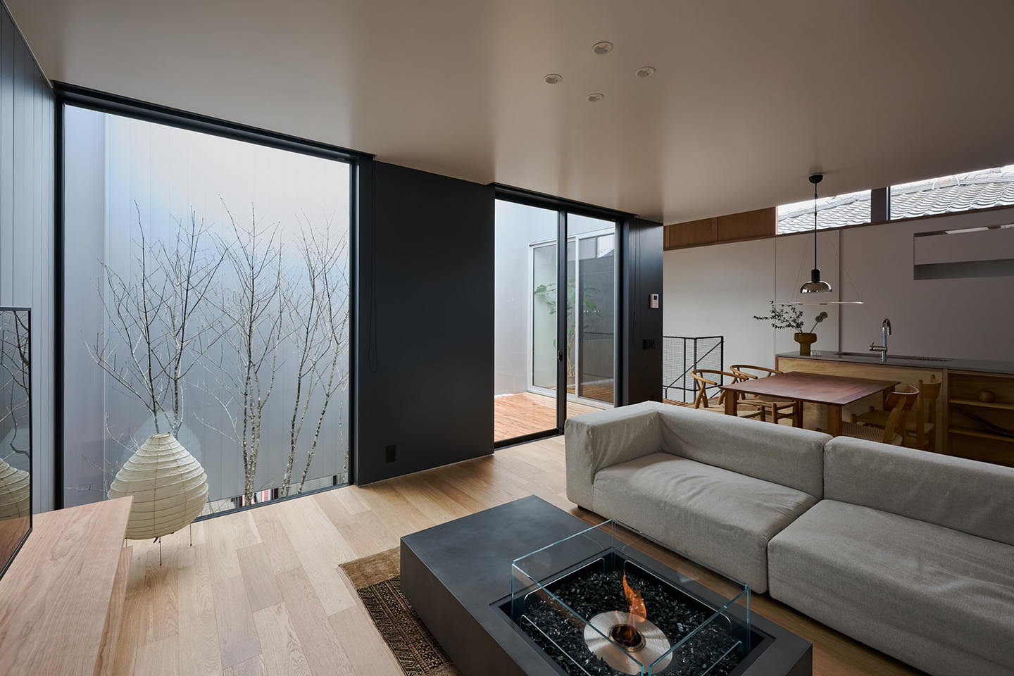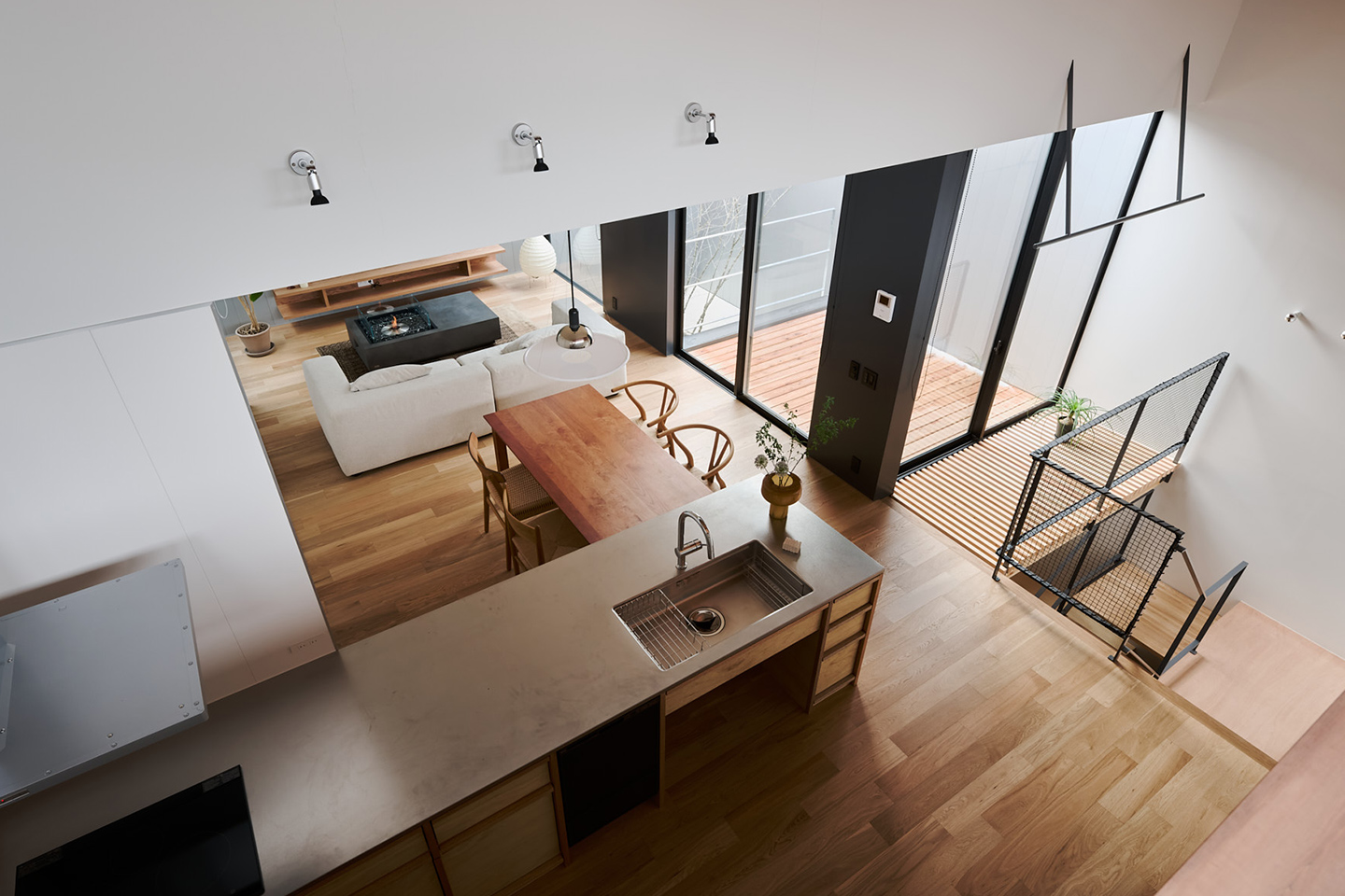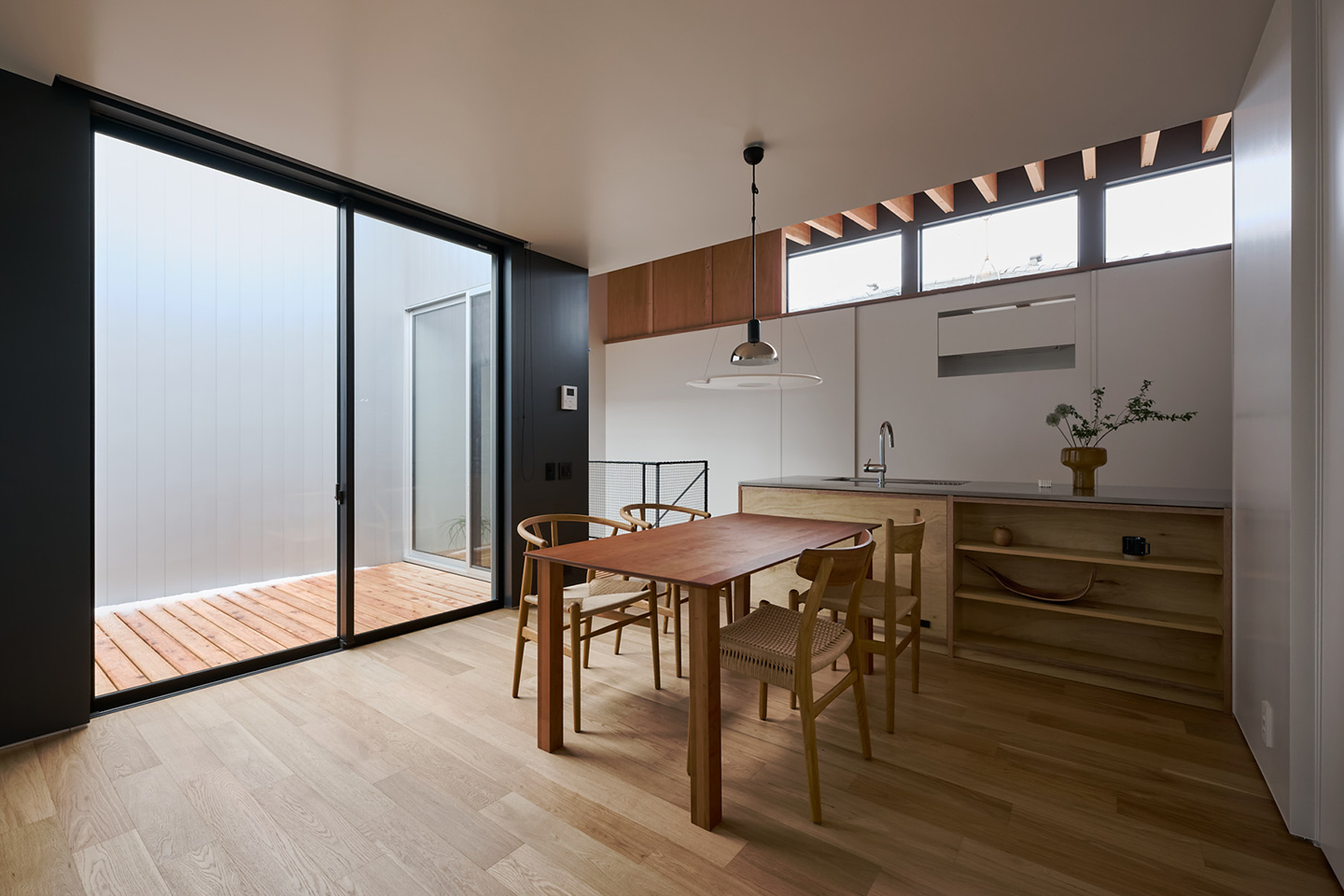 対照的に、ダイニング・リビングは、2.4mの天井高とすることで、空間に抑揚を持たせ、広がりをより強く感じられるようにしました。外壁のガルバリウムをあえてリビングの内側にも採用することで、外と内の空間をより一体に感じられるようにしています。また、窓側の壁を黒で統一することで、バルコニーや庭を近くに感じられるように工夫しています。
