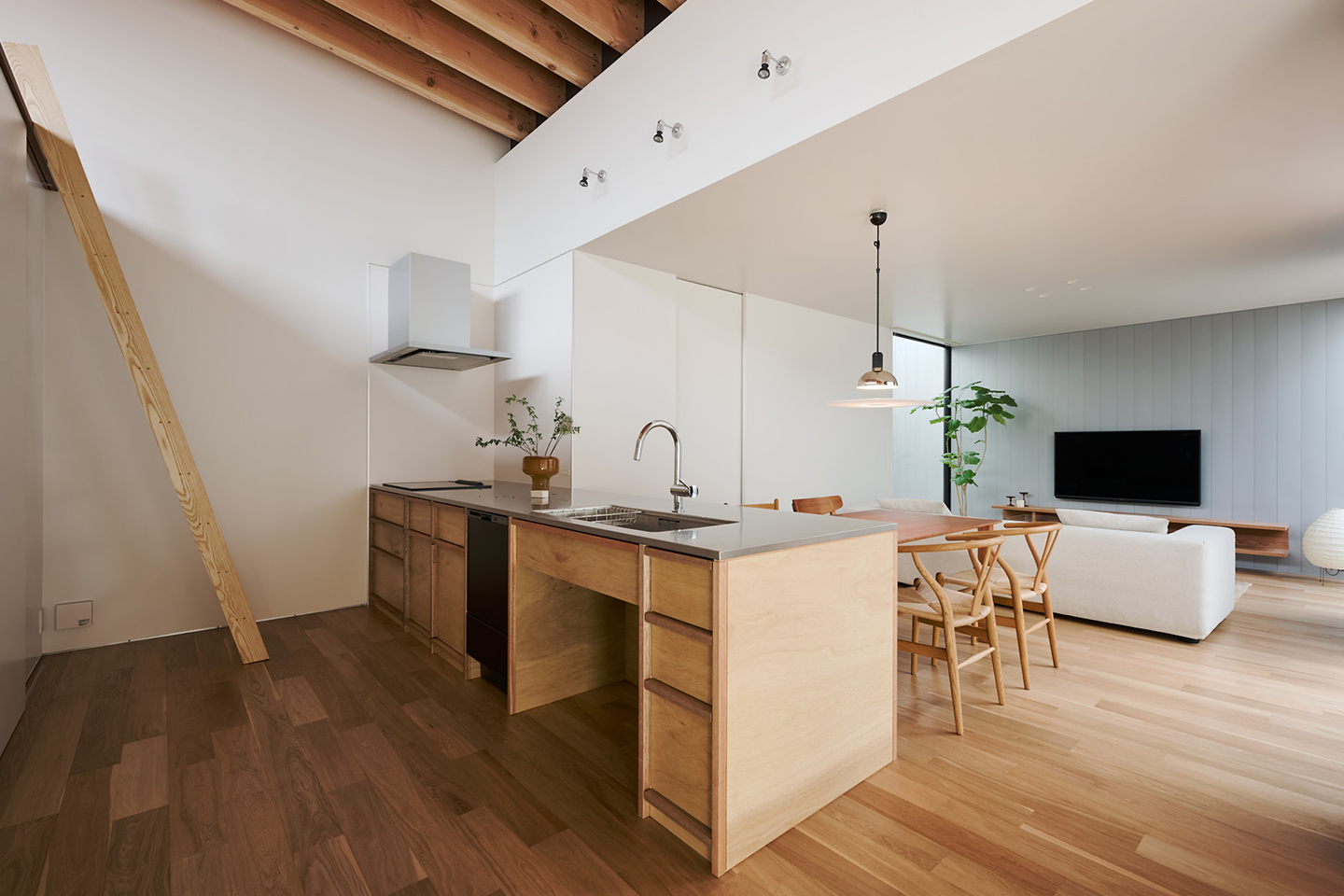 LDKは約23畳の広さです。天井の高さはキッチン部分を約4mとし、構造用の梁の現し天井としました。木の色合いを入れることで空間に温かみが感じられるようにしています。