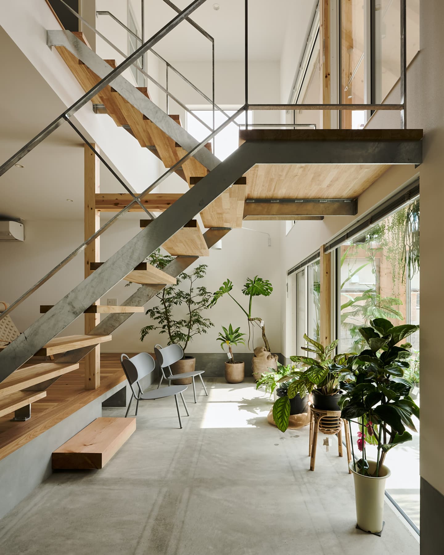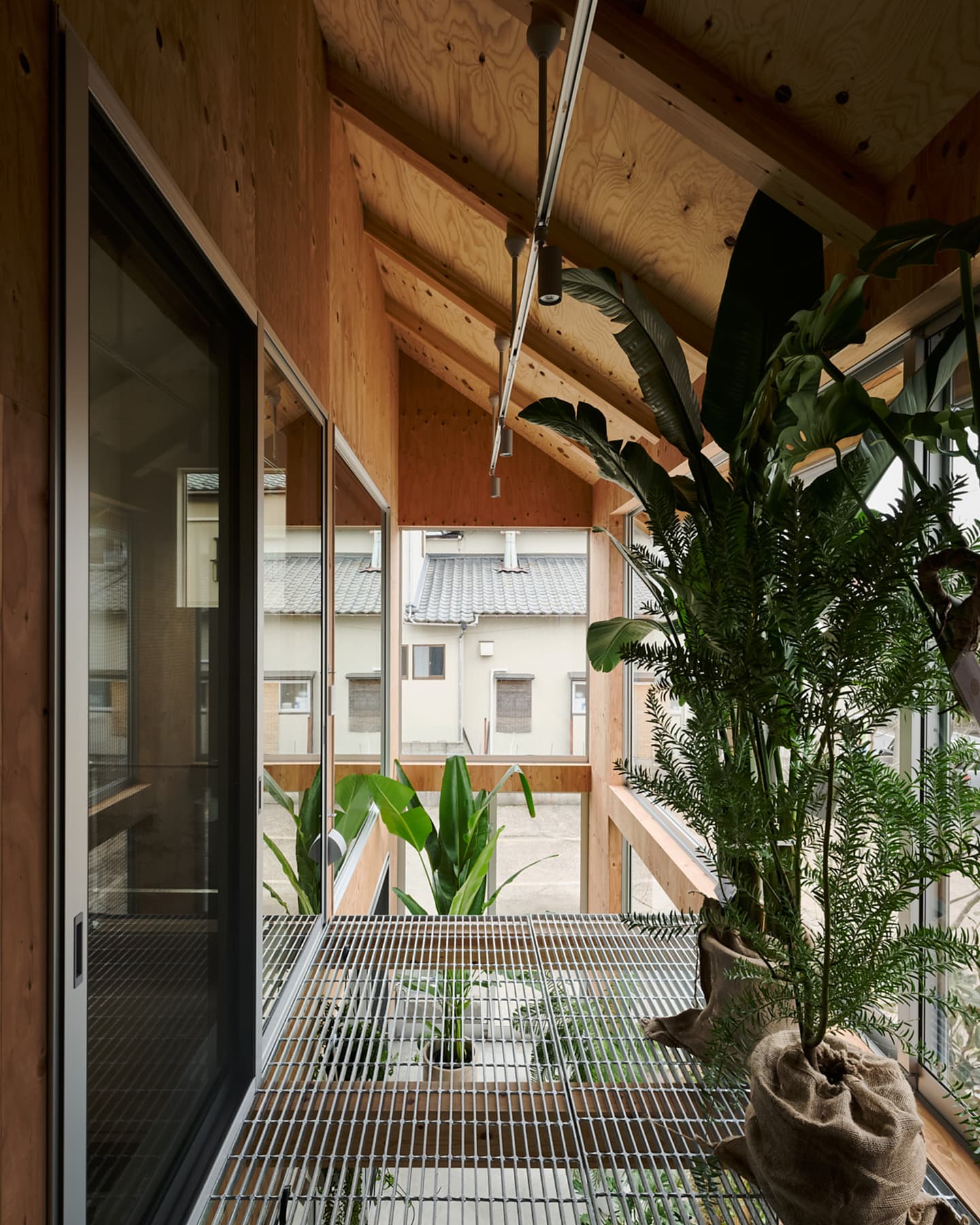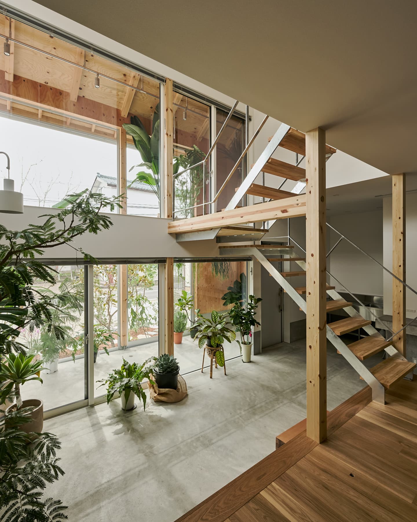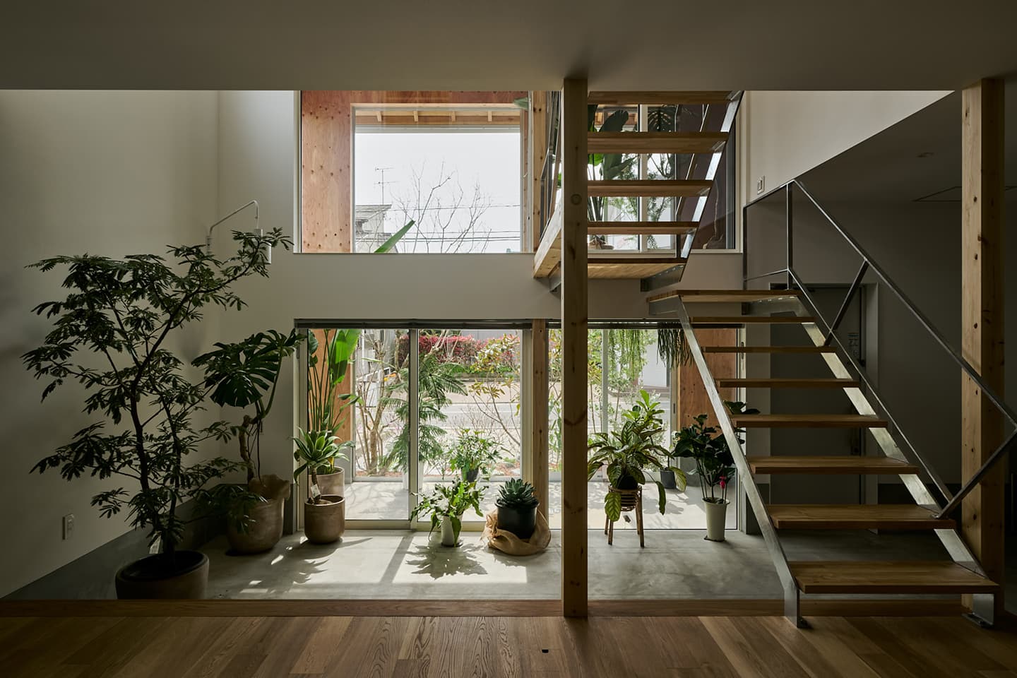 空気や光が段階的に流れ込み、植物と暮らす心地よさが住まい全体に広がります。温室が外と内をやわらかく結び、家族の暮らしに季節の移ろいを添える住まいです。