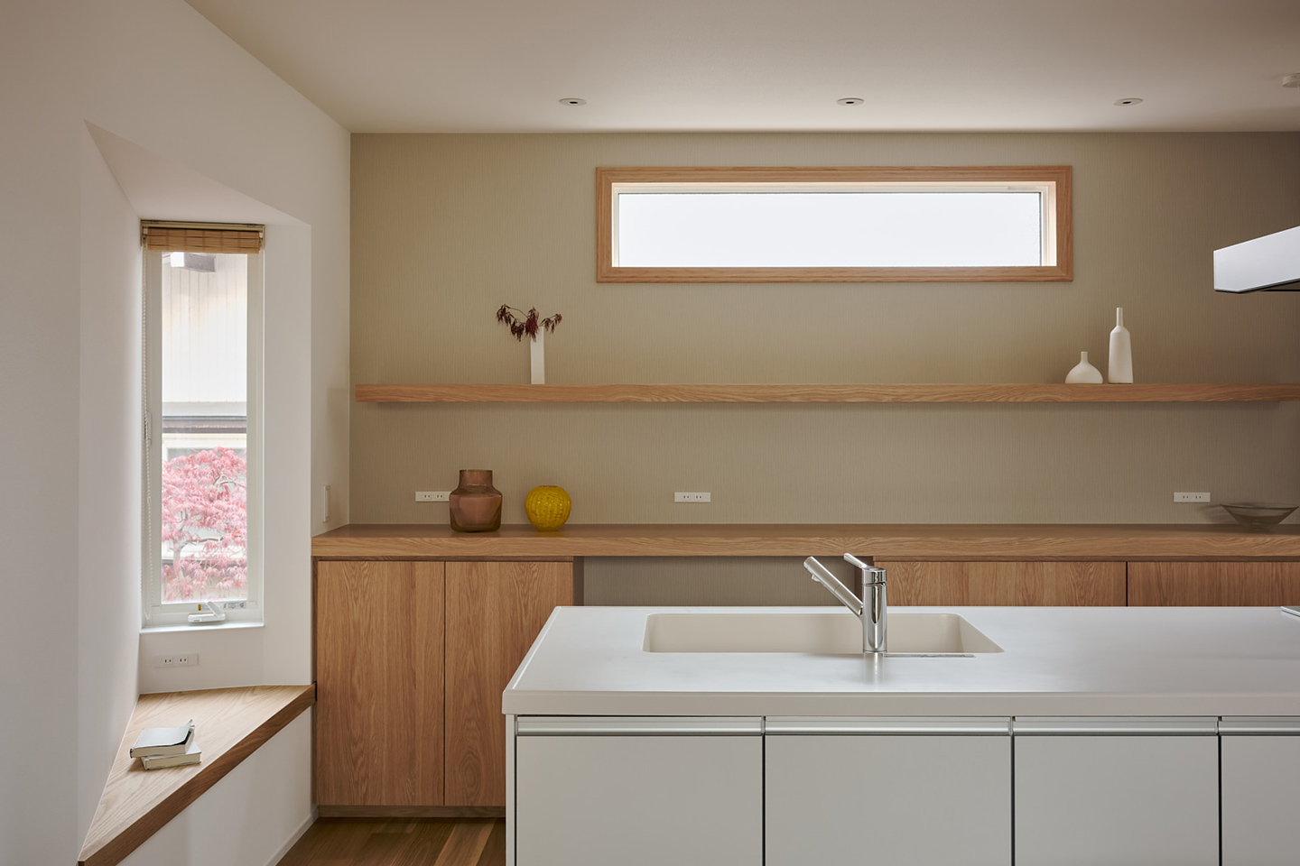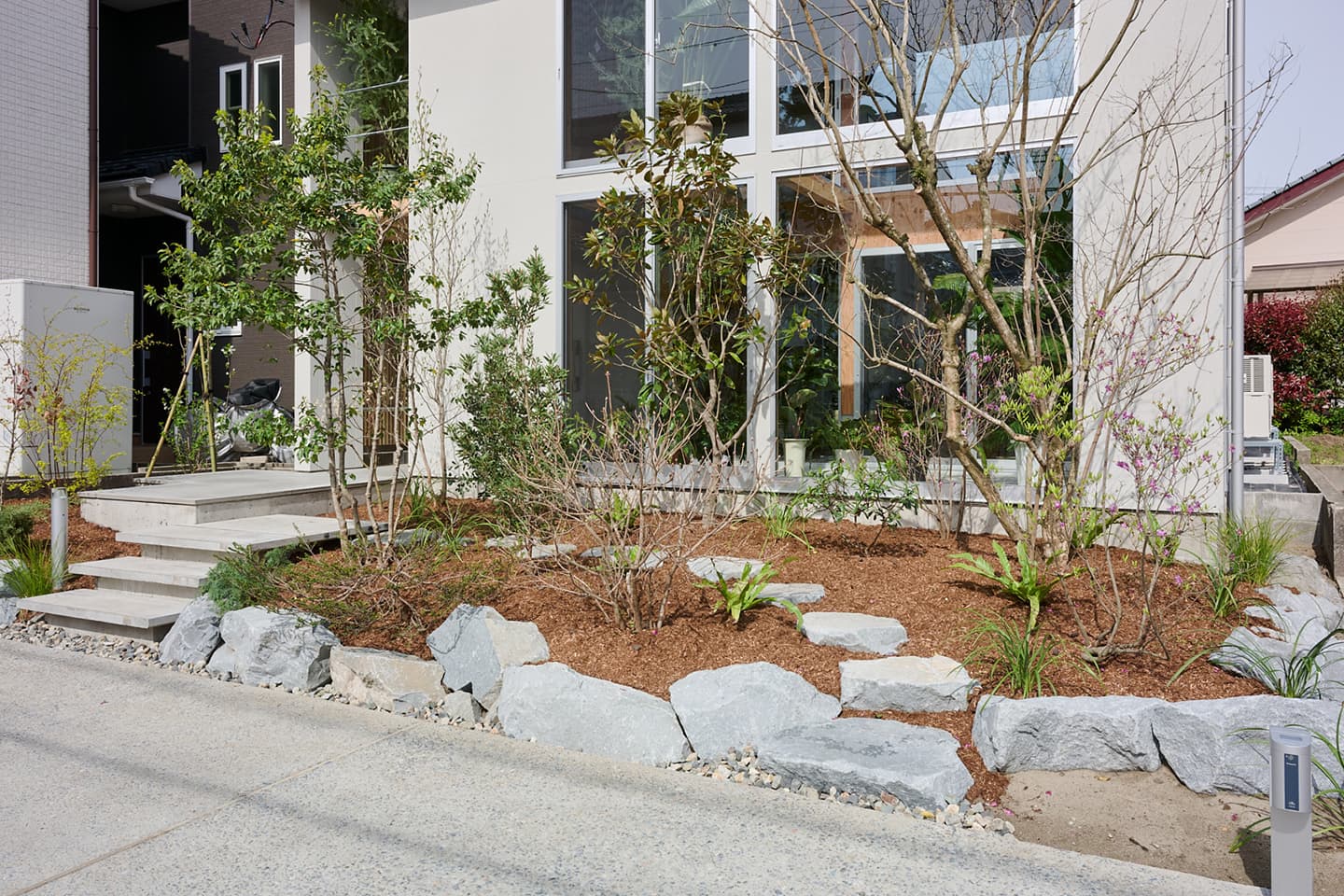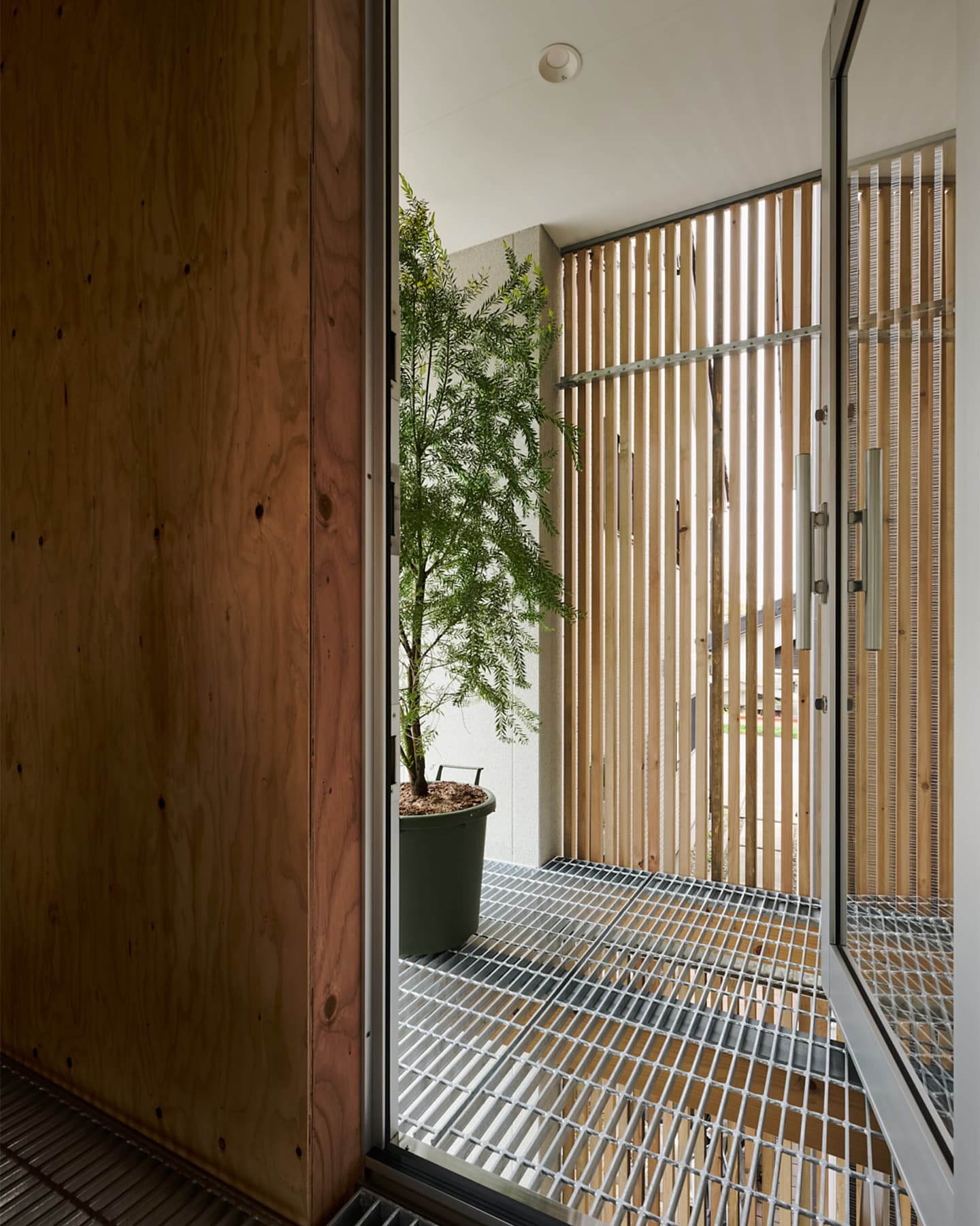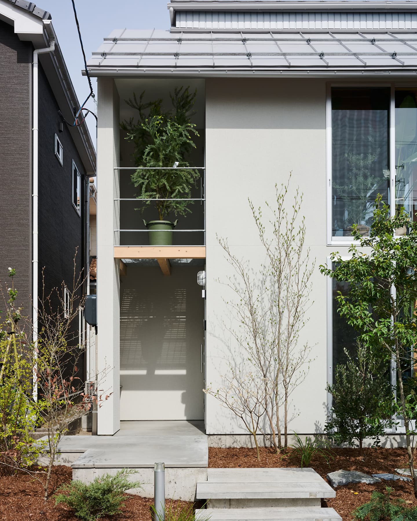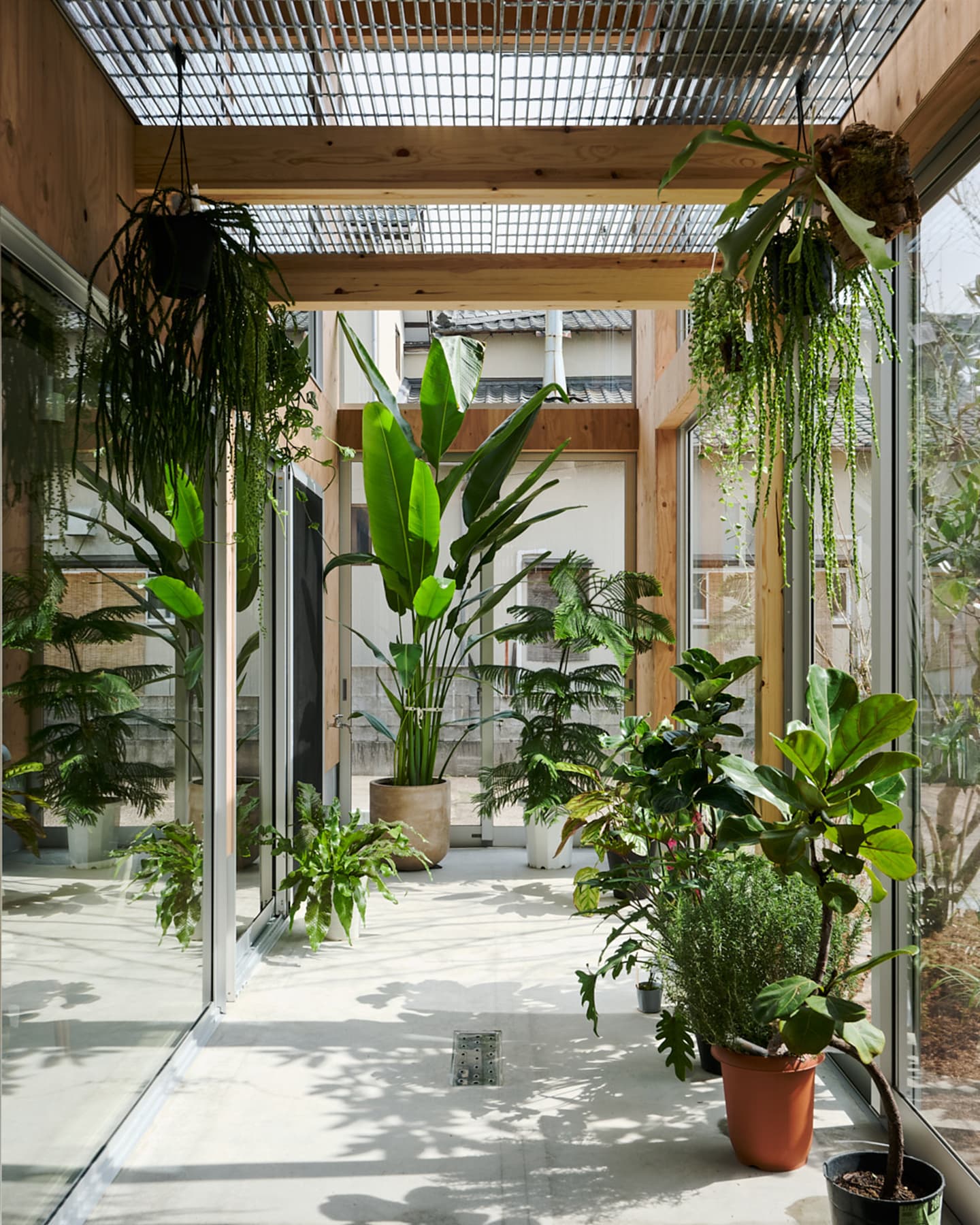 空気や光が段階的に流れ込み、植物と暮らす心地よさが住まい全体に広がります。温室が外と内をやわらかく結び、家族の暮らしに季節の移ろいを添える住まいです。