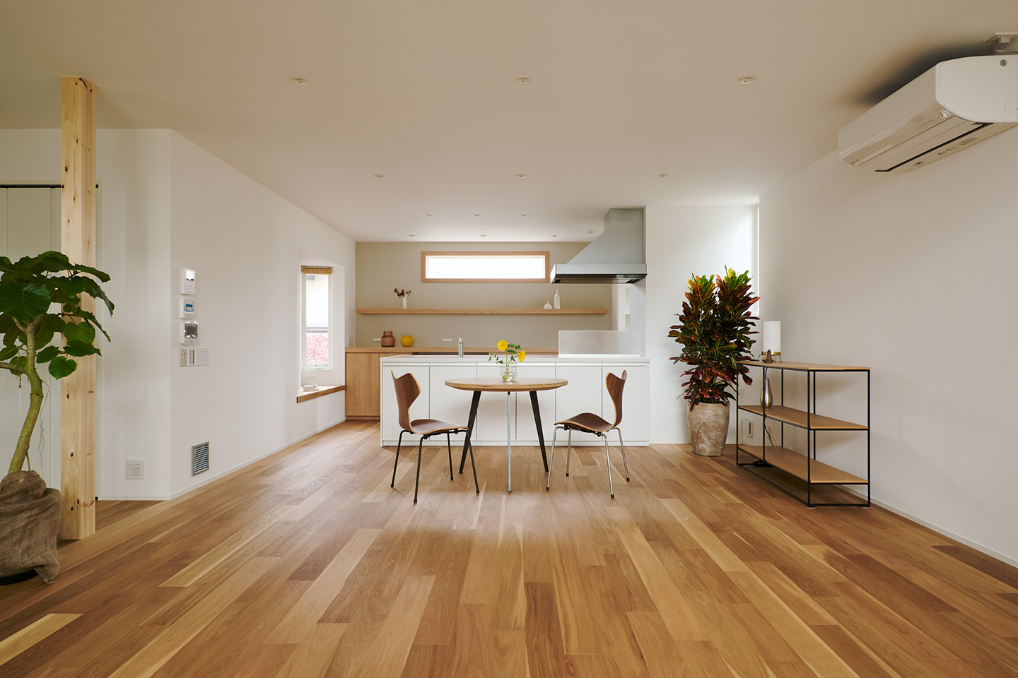玄関を入ると広がる土間は、外と内をつなぐ中間領域です。靴のまま出入りできるこの場所は、植物の手入れをしたり、冬場は寒さに弱い鉢を避難させたりと、多目的に使えます。 外気と室内をつなぐ緩衝帯として、暮らしにリズムを与えるスペースです。LDKは庭や温室の緑を望むように配置され、時間とともに変化する光が室内をやさしく照らします。