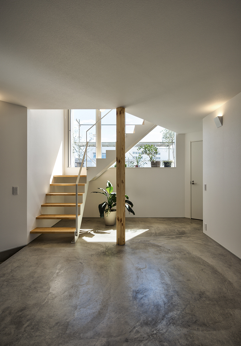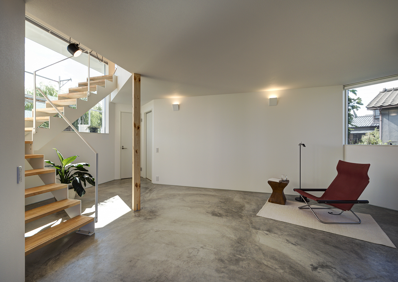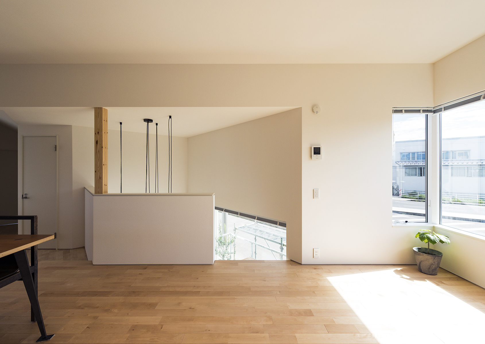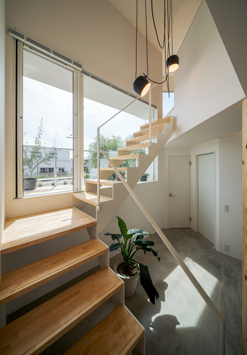 内部空間は幹線道路の喧騒をリセットできるよう窓を高い位置に設けています。2階にある大きなピクチャーウインドウからは前面の柳並木が見え、ここに住むことで得られる味わいがあります。玄関ホールの吹抜けには屋外の踊り場テラスと接続したL型階段を設け、その中間階の存在が上下階の連続性を増幅させています。