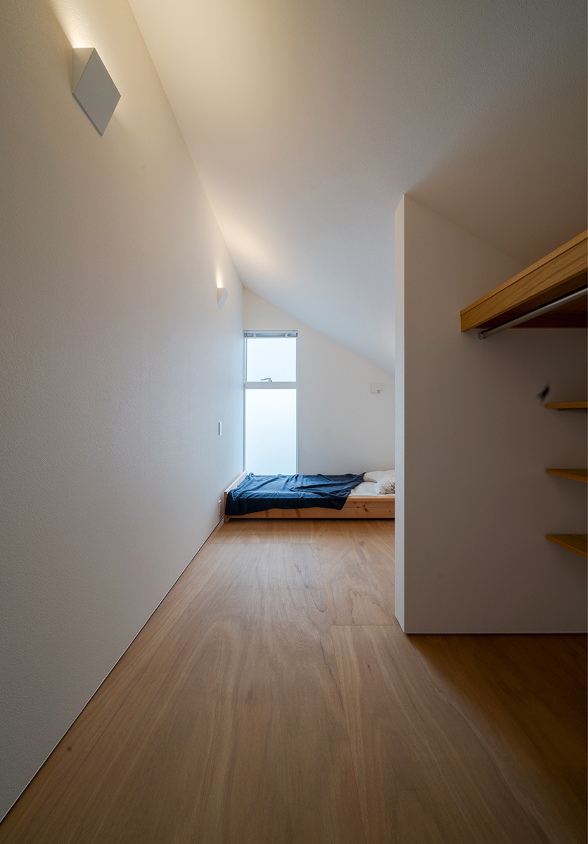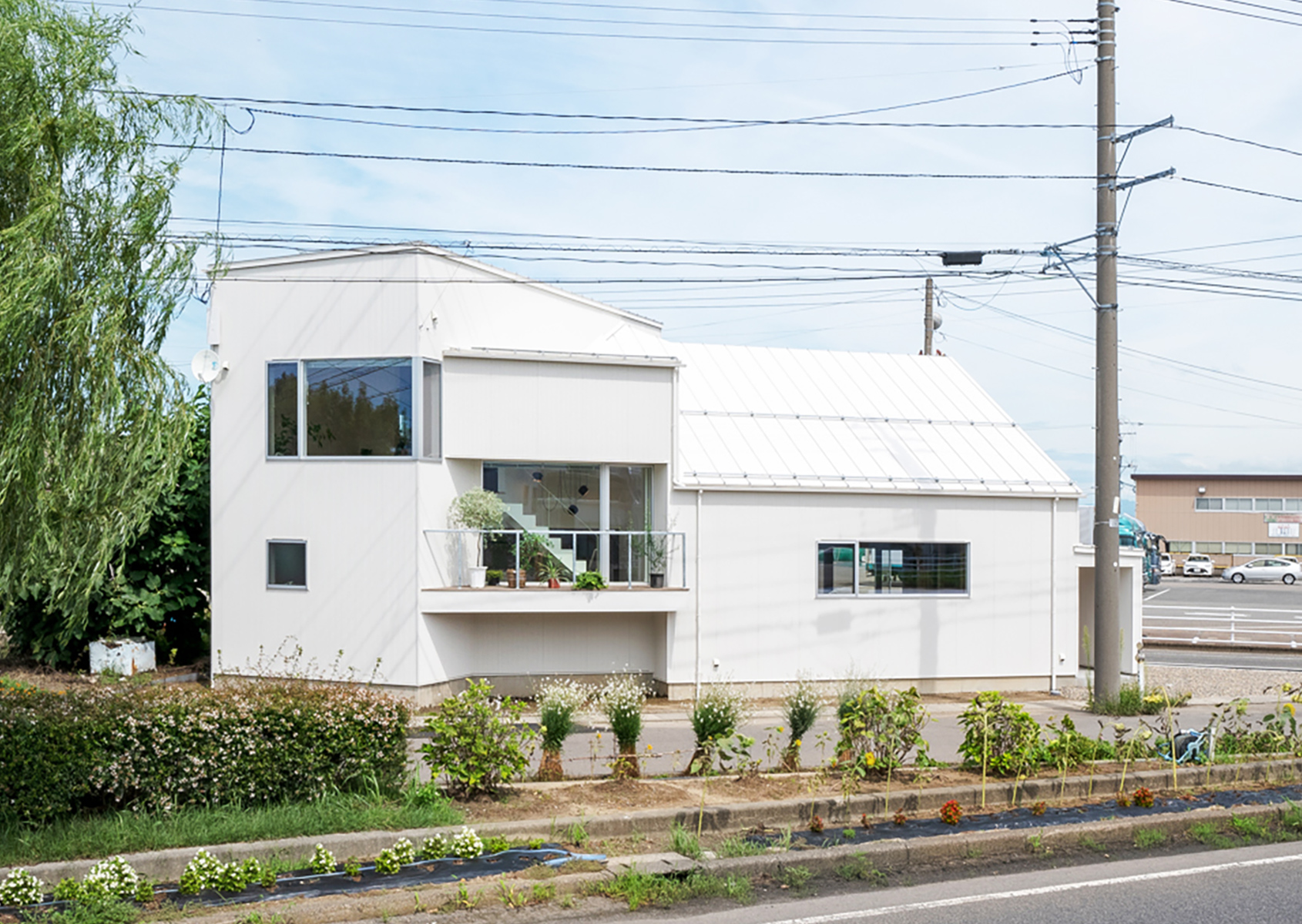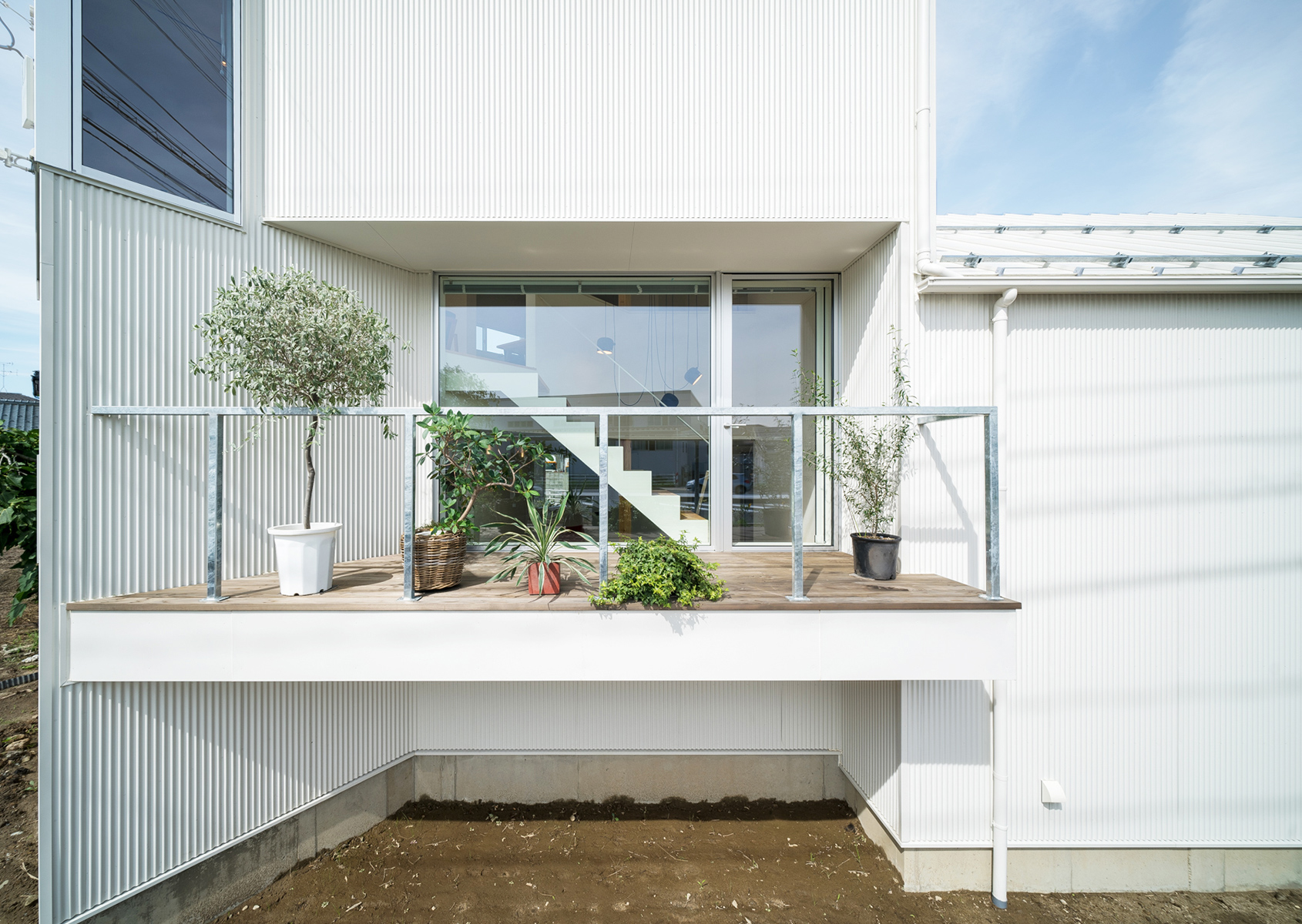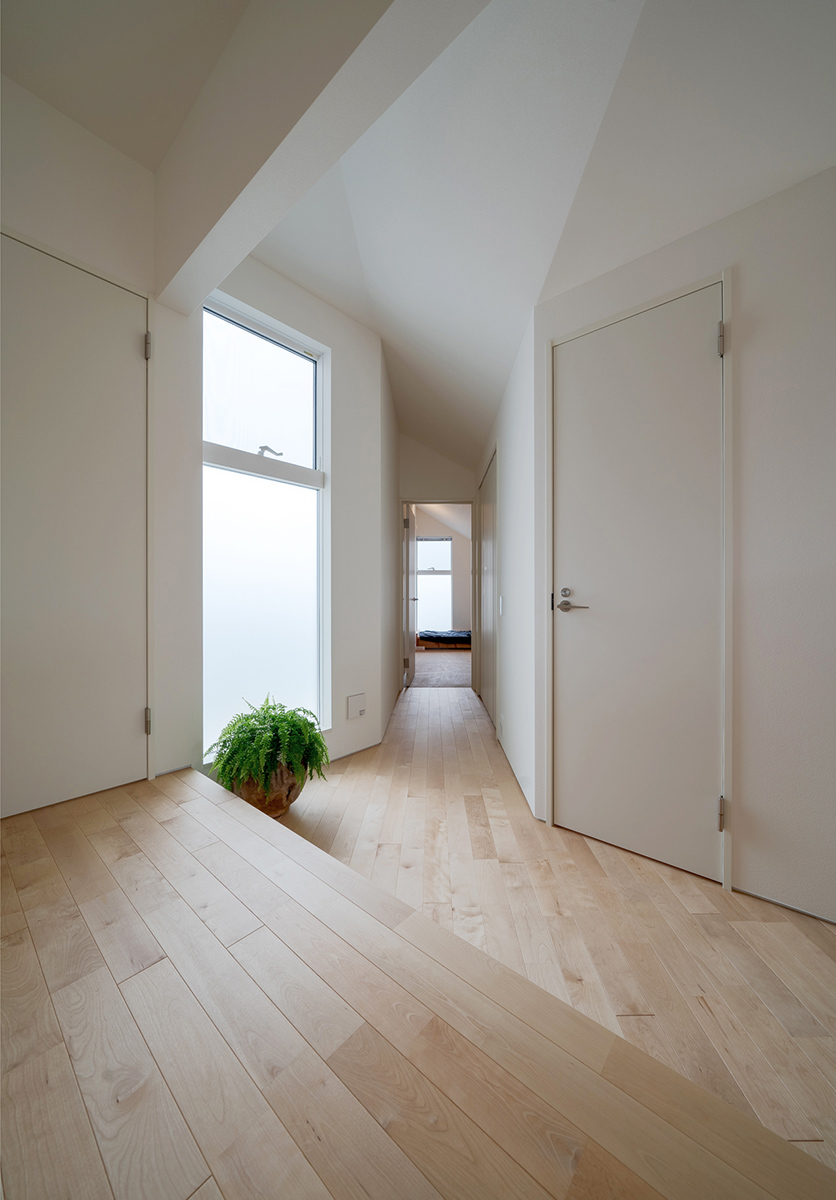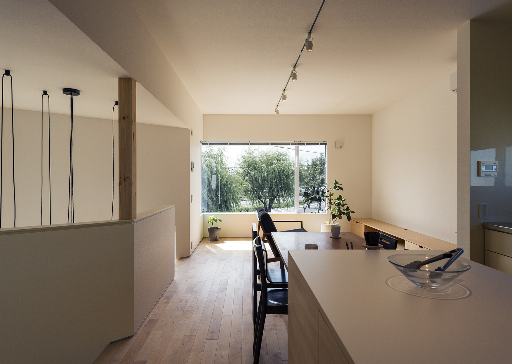 内部空間は幹線道路の喧騒をリセットできるよう窓を高い位置に設けています。2階にある大きなピクチャーウインドウからは前面の柳並木が見え、ここに住むことで得られる味わいがあります。玄関ホールの吹抜けには屋外の踊り場テラスと接続したL型階段を設け、その中間階の存在が上下階の連続性を増幅させています。