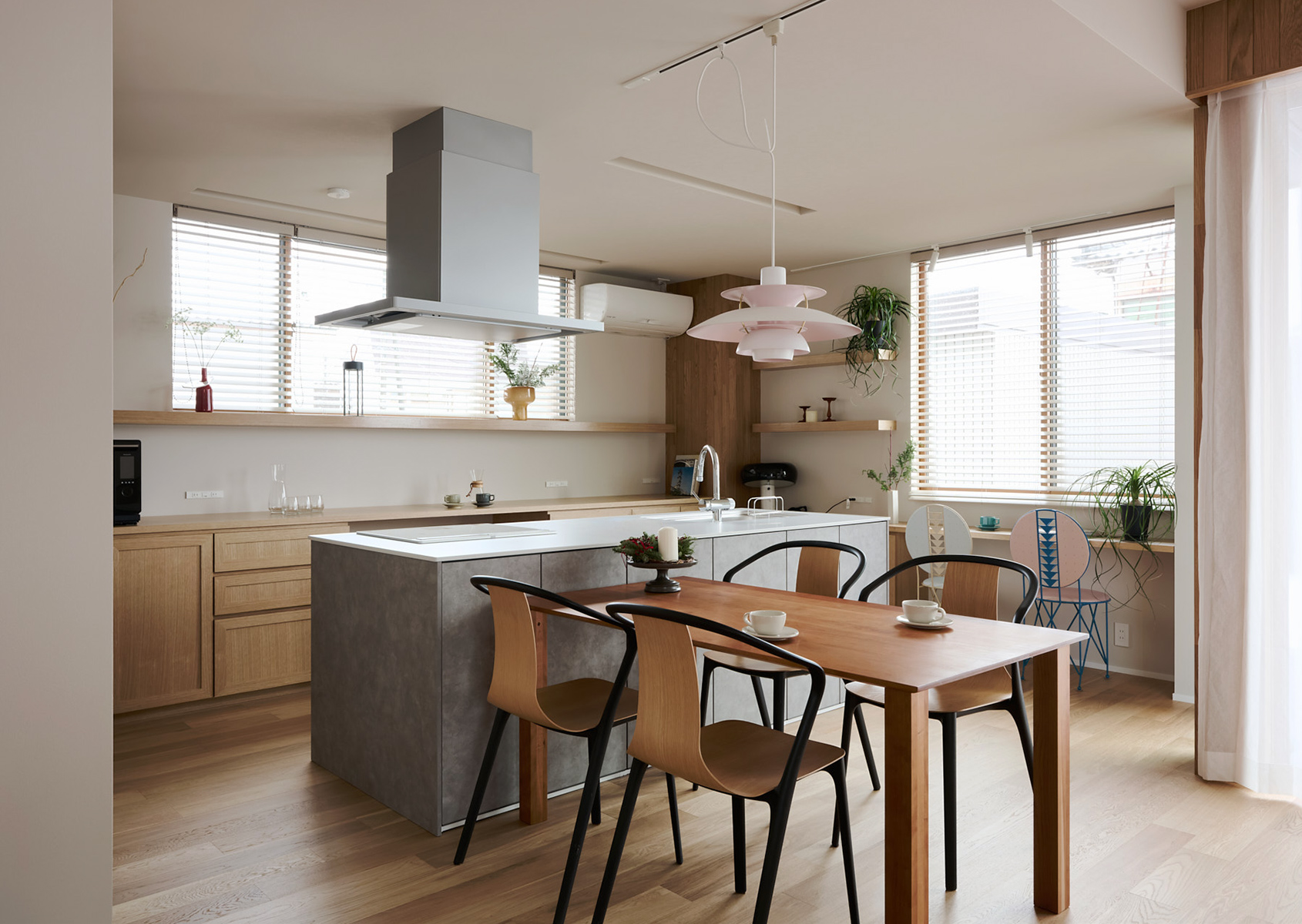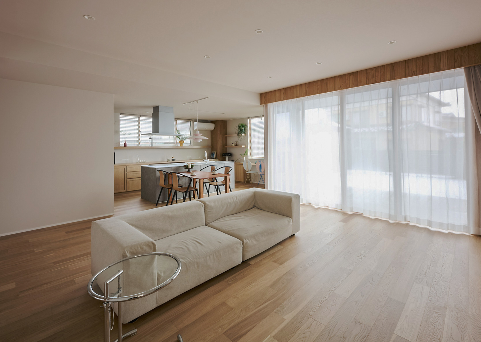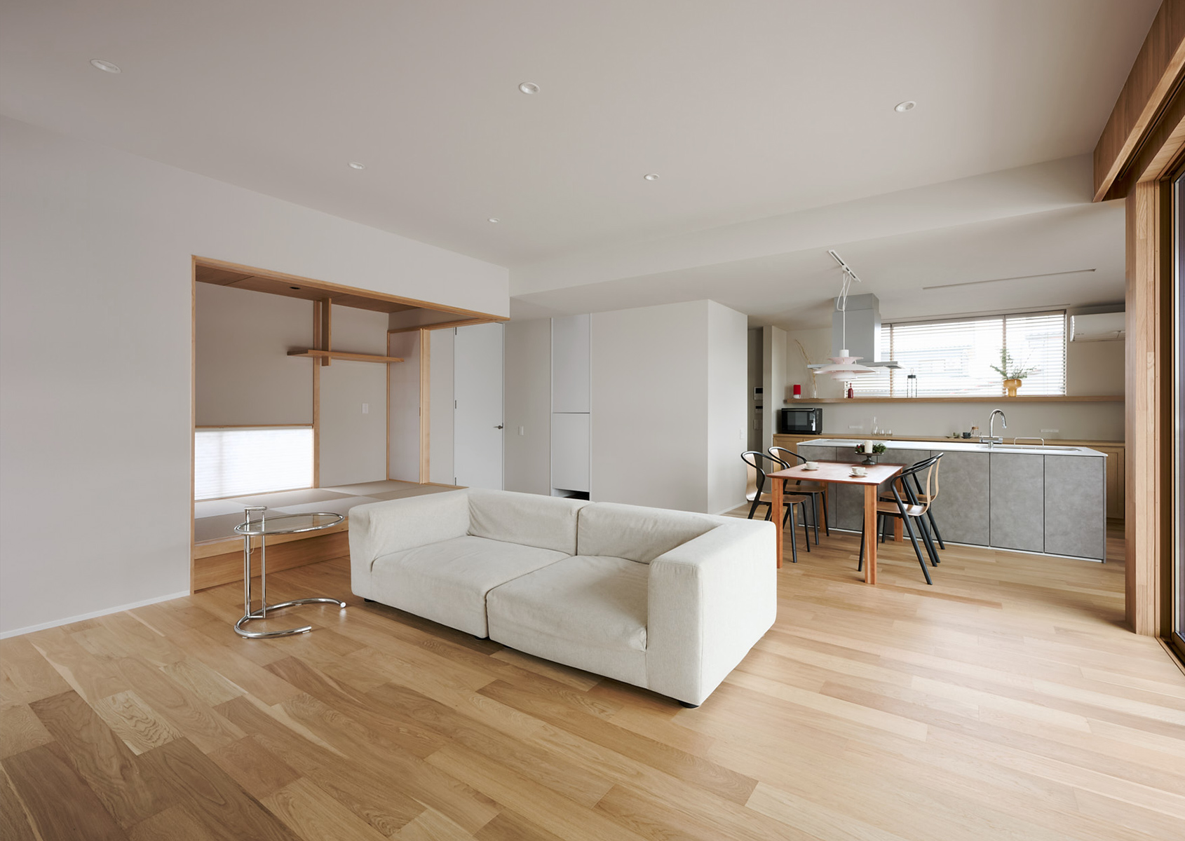 二世帯が共に暮らしていた以前の建物は、畳の続き間や広い玄関など、奥ゆかしさを感じる住宅でした。子どもたちも育ち、使用しない部屋も多く残っていたため、セカンドライフへ向けた新しいの暮らしへアップデートを計画しました。