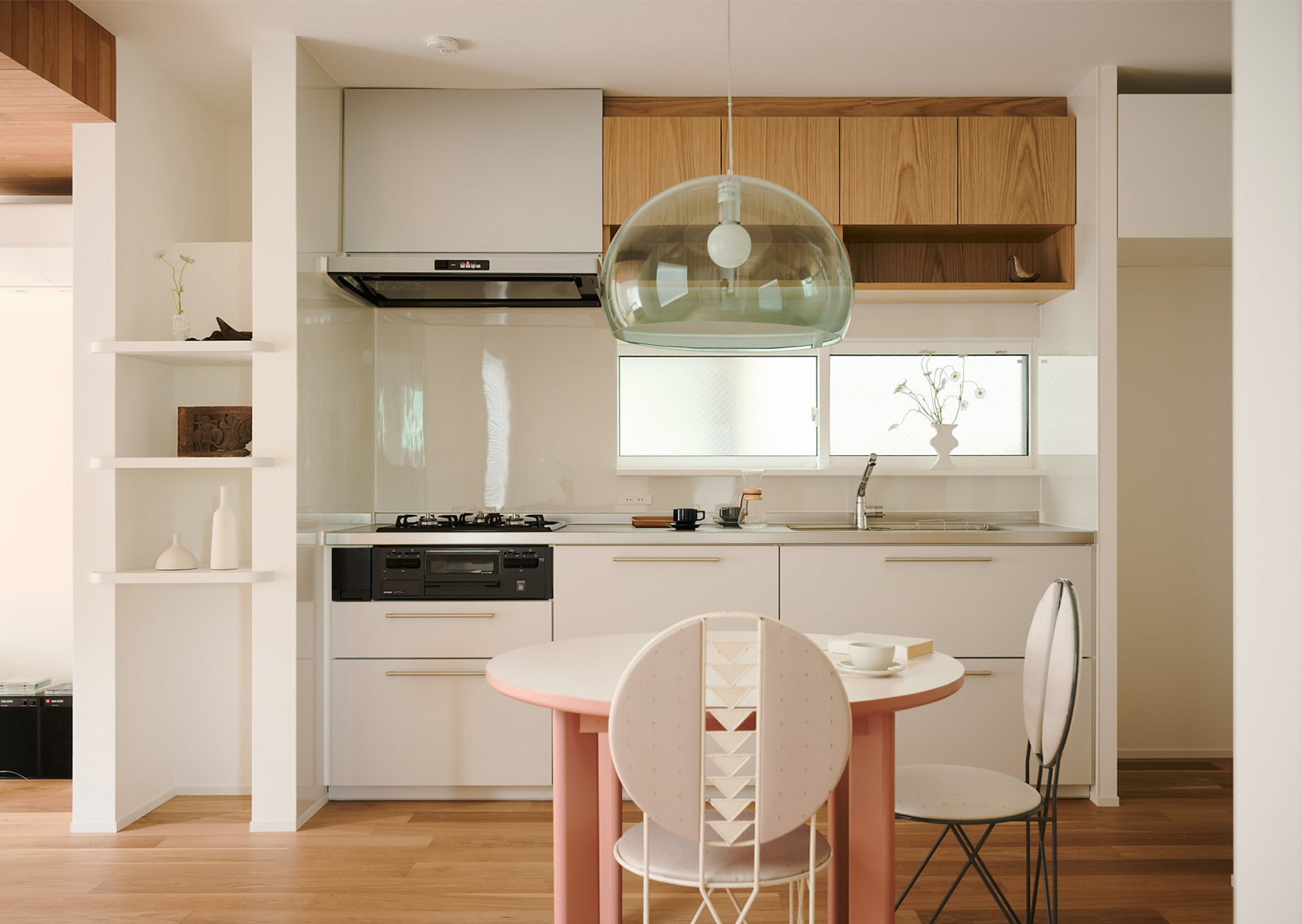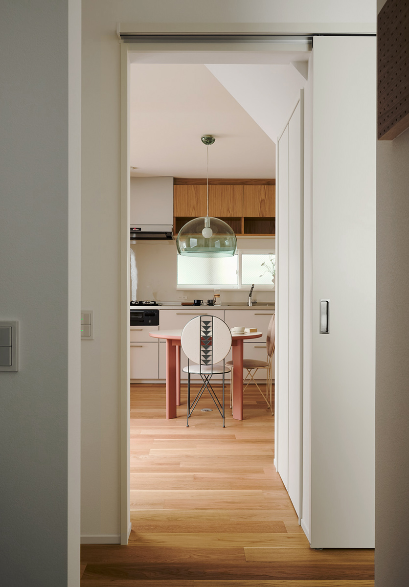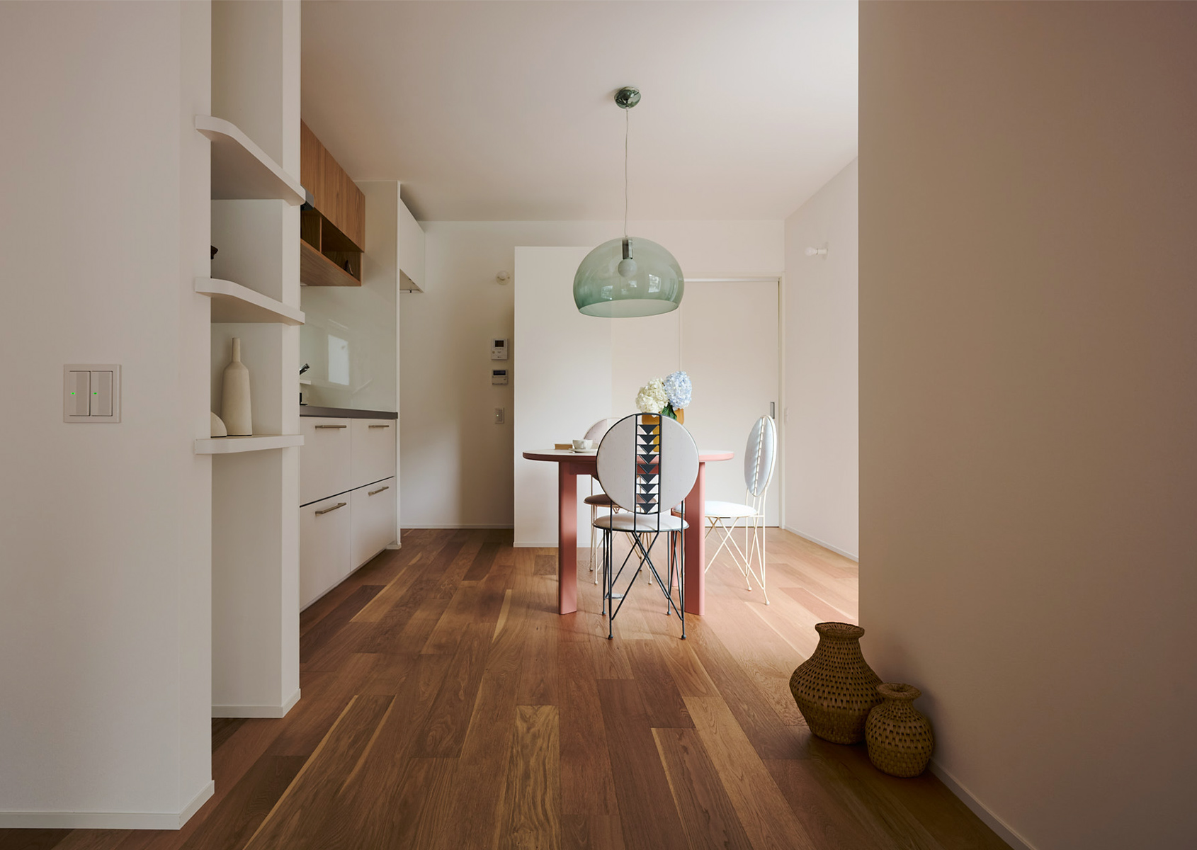 既存の建物は、増築を経て異なる年代の建物がつながっている状態でした。今回はそのうち古い東側の一部を減築し、LDKへの採光を確保。暗かったキッチンに開口部を設けて光を取り入れ、東側に移したリビングは朝日が差し込む明るい居場所となりました。 水まわりの配置は大きく変えずに空間を整理し、暮らしにゆとりのある間取りへと再構成しています。 スポーツが好きなご夫婦の暮らしに合わせて、玄関にはゆとりのある土間と納戸を設けました。アウトドア用品の収納や手入れができる、実用的で使いやすいスペースです。 また、祖母の代から引き継がれてきた家の記憶を大切にするために、無垢の階段や趣のある柱、照明など、時を重ねた味わいのある部分はそのまま残しました。新旧が自然に溶け合い、住まいに豊かな表情を与えています。