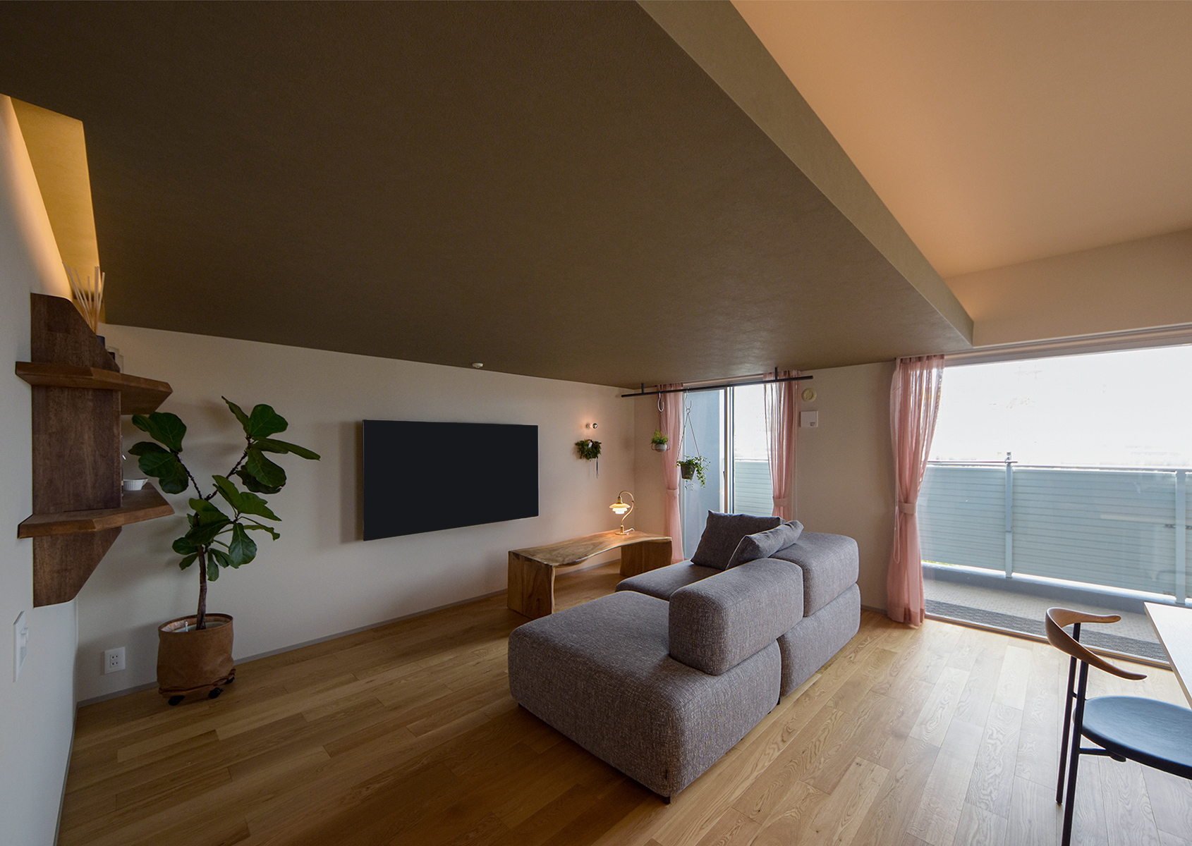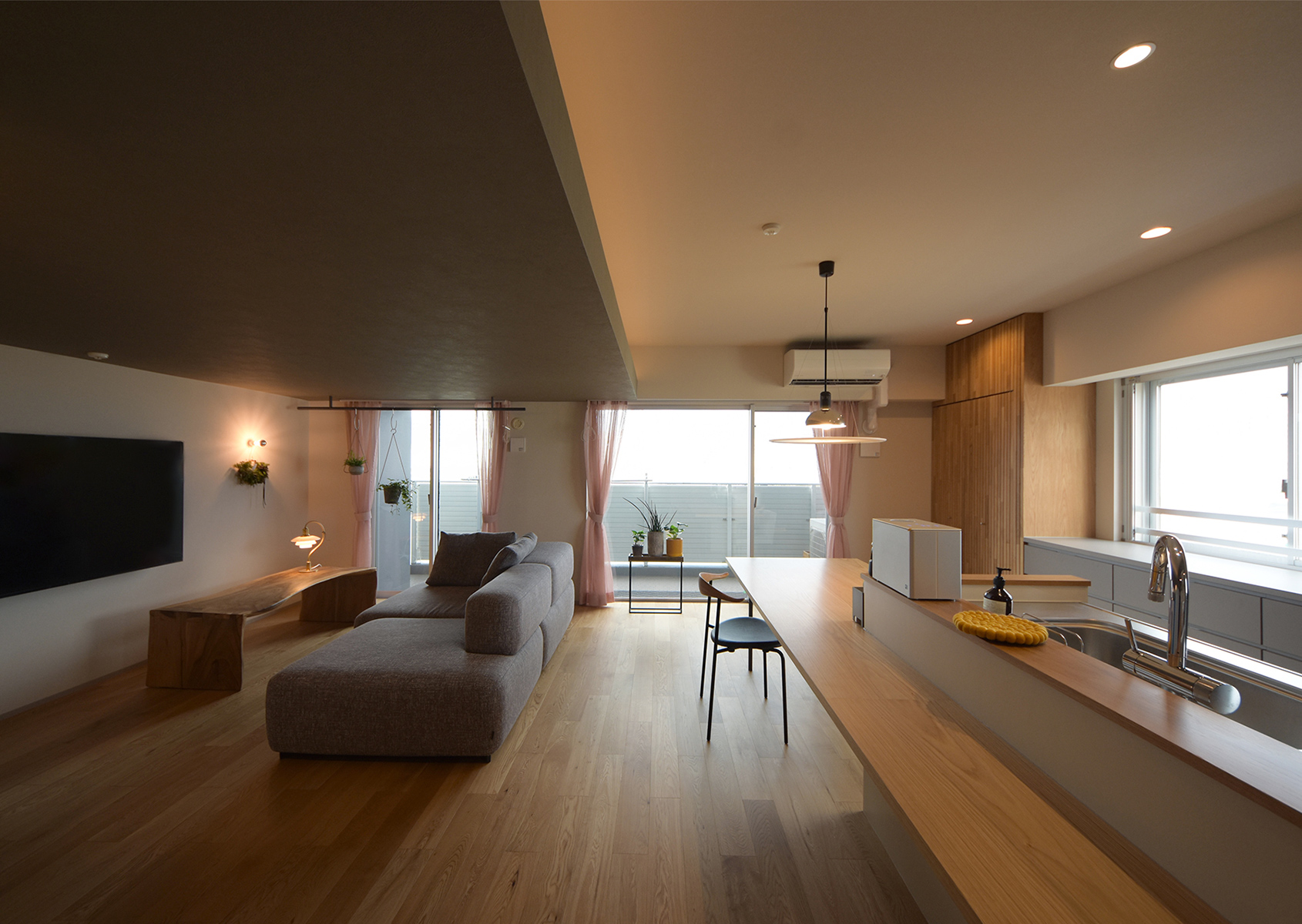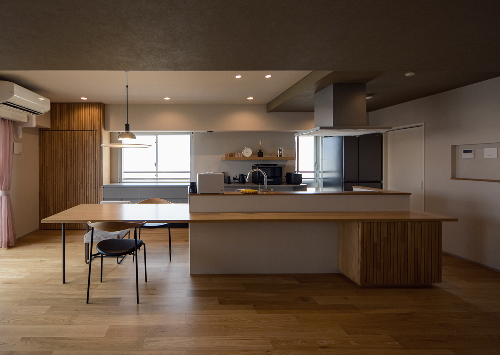 リビングはあえて天井を低めに設計し、重心をコントロールすることで、自然と視線が眺望側の窓へ向かうように計画しました。川の流れが見え、外の景色を最大限に楽しめる、落ち着いた居場所となっています。ダイニングのペンダントライトには、眺望を妨げないFLOSの「Frisby」を採用。背面キャビネットからテーブルまでを一体的にデザインし、軽食や作業ができるカウンターも設けました。