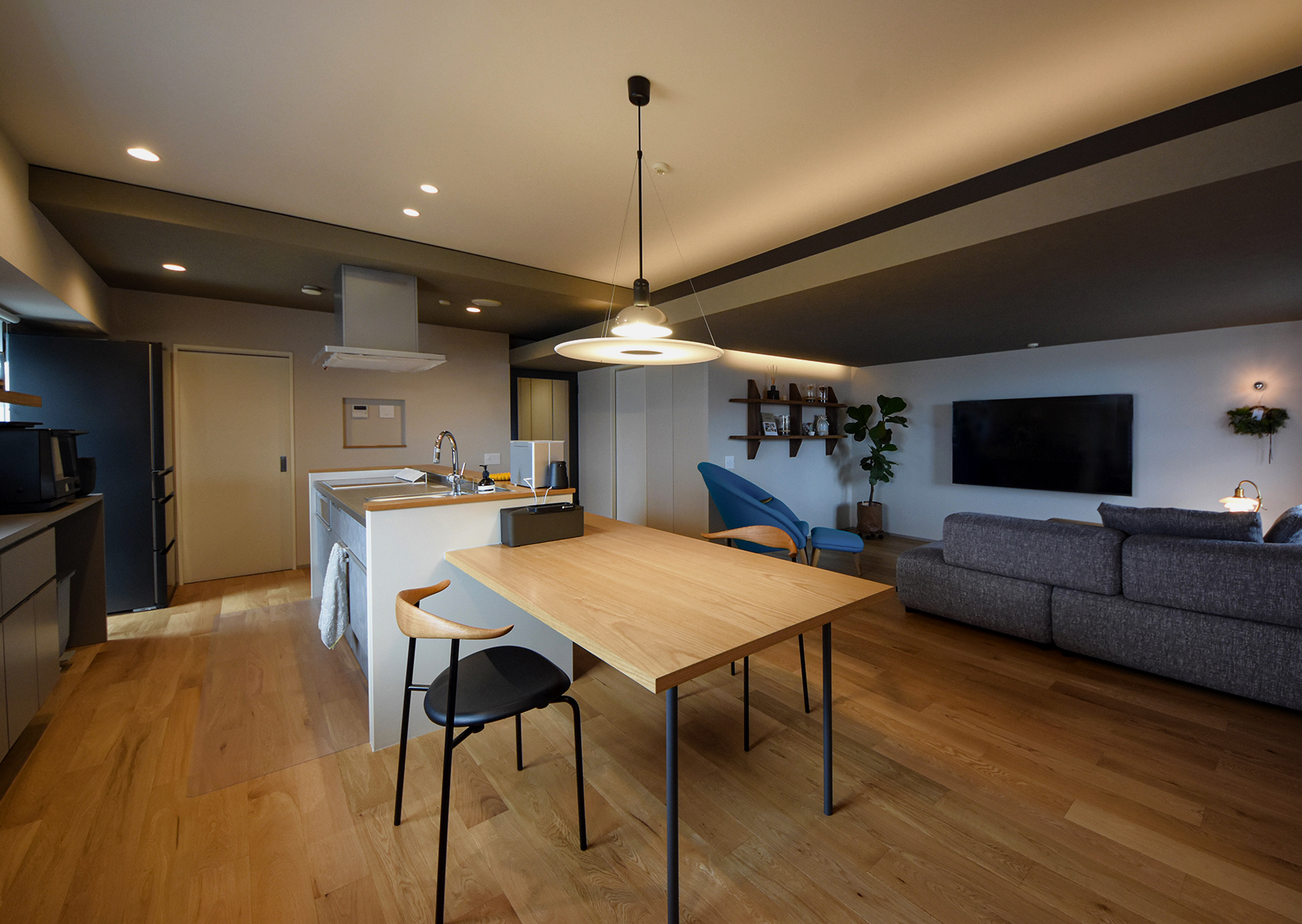 購入された住戸は、片側が壁付けになった対面キッチンと、間仕切りの奥に和室がある、昔ながらの間取りでした。北欧家具がお好きなお二人の暮らしに合わせるため、和室の間仕切りを取り払い、家具を配置しやすく、ひとつながりの広がりを感じられるレイアウトへと再構築しました。