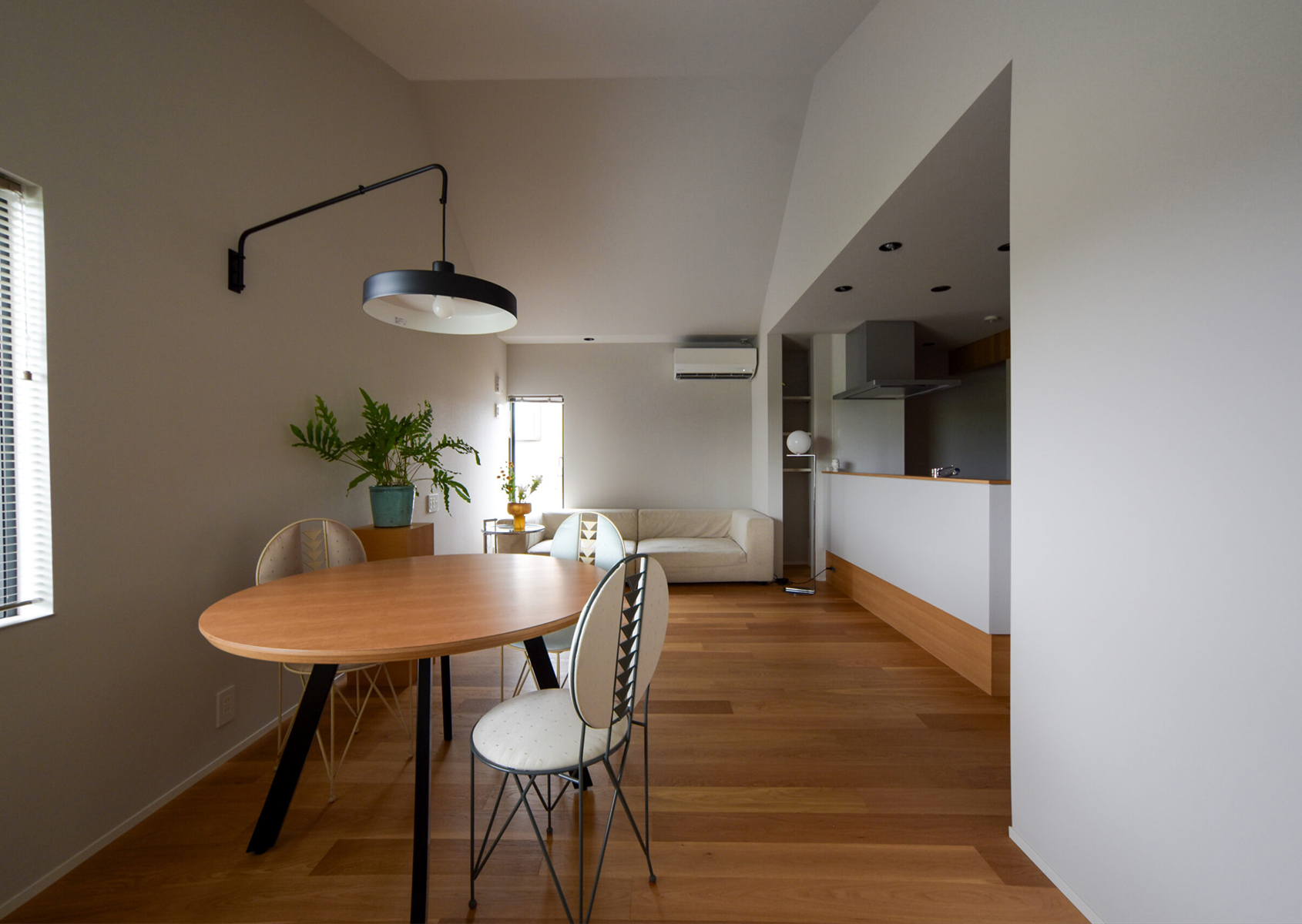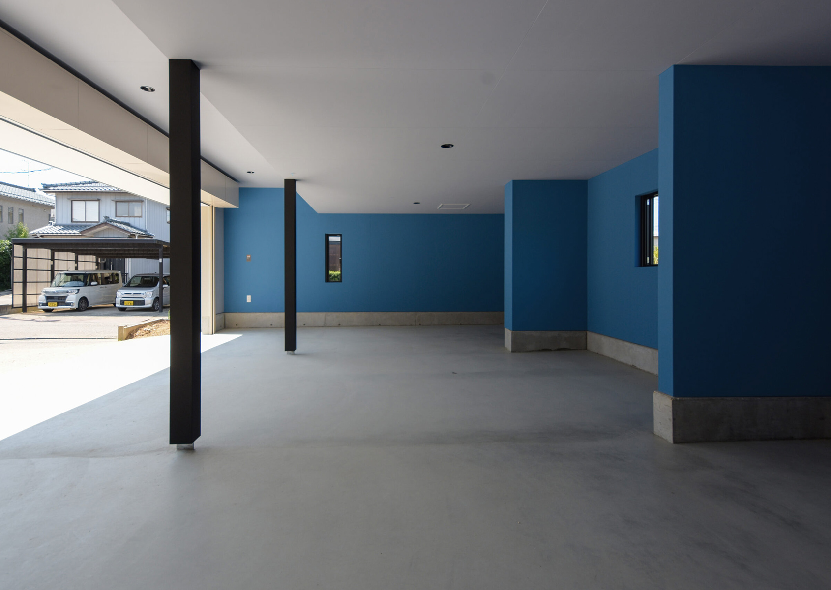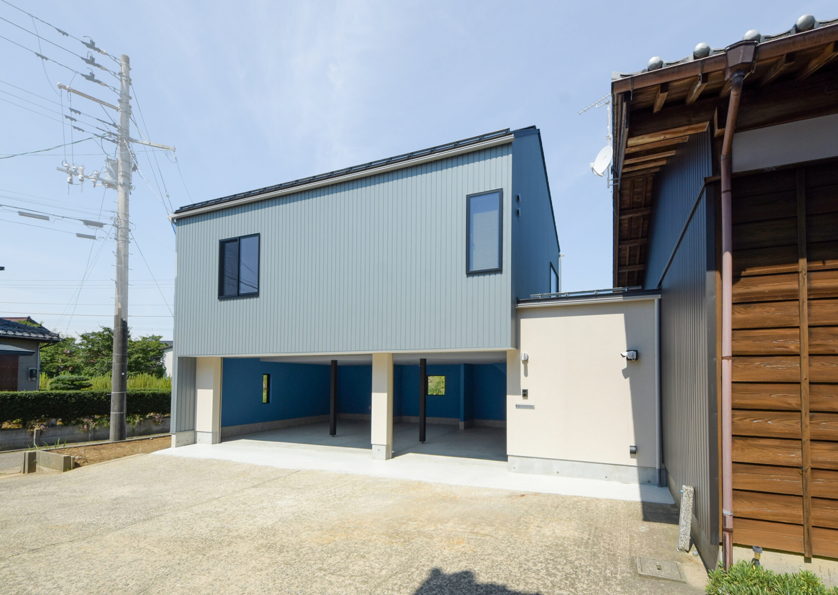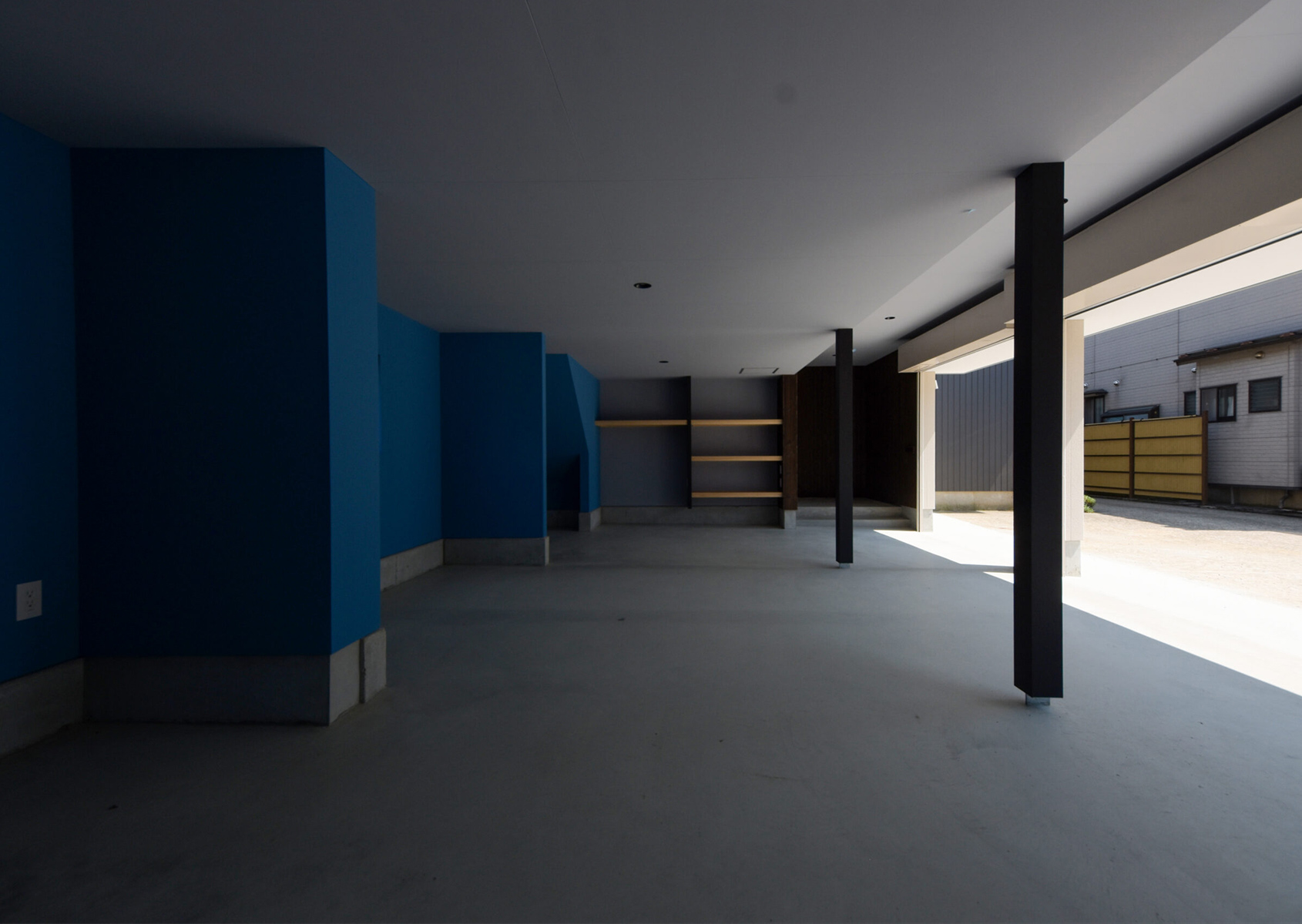 母屋とは行き来ができるようにし、母屋で空いた部屋を子供部屋として活用します。同居という形式の中で、ご夫婦のプライベートスペースを確保しつつ、お互いの生活を分かち合うことで、生活リズムを調整しながら助け合い、共存することを目指した住まいです。増築部は、1階に3台分のインナーガレージを、2階にはコンパクトなLDKと主寝室・水回りを設えました。コンパクトだからこそ、母屋でのおおらかな暮らしとの対比が生まれ、空間の広がりや居心地の良さをより強く感じられる住まいとなっています。