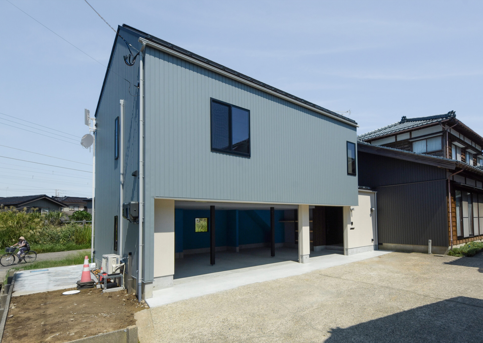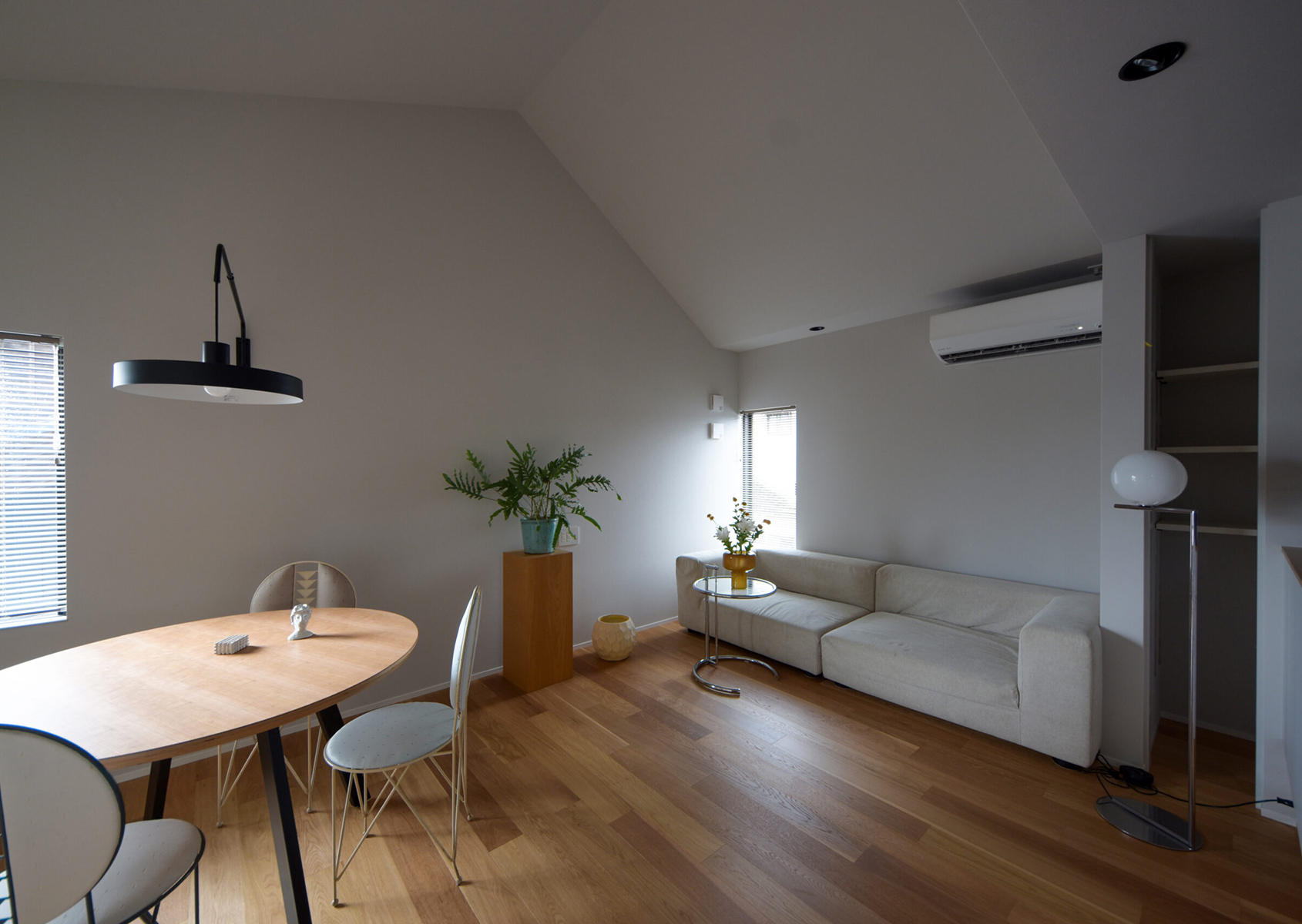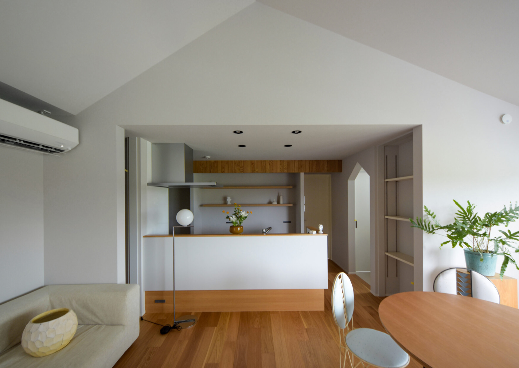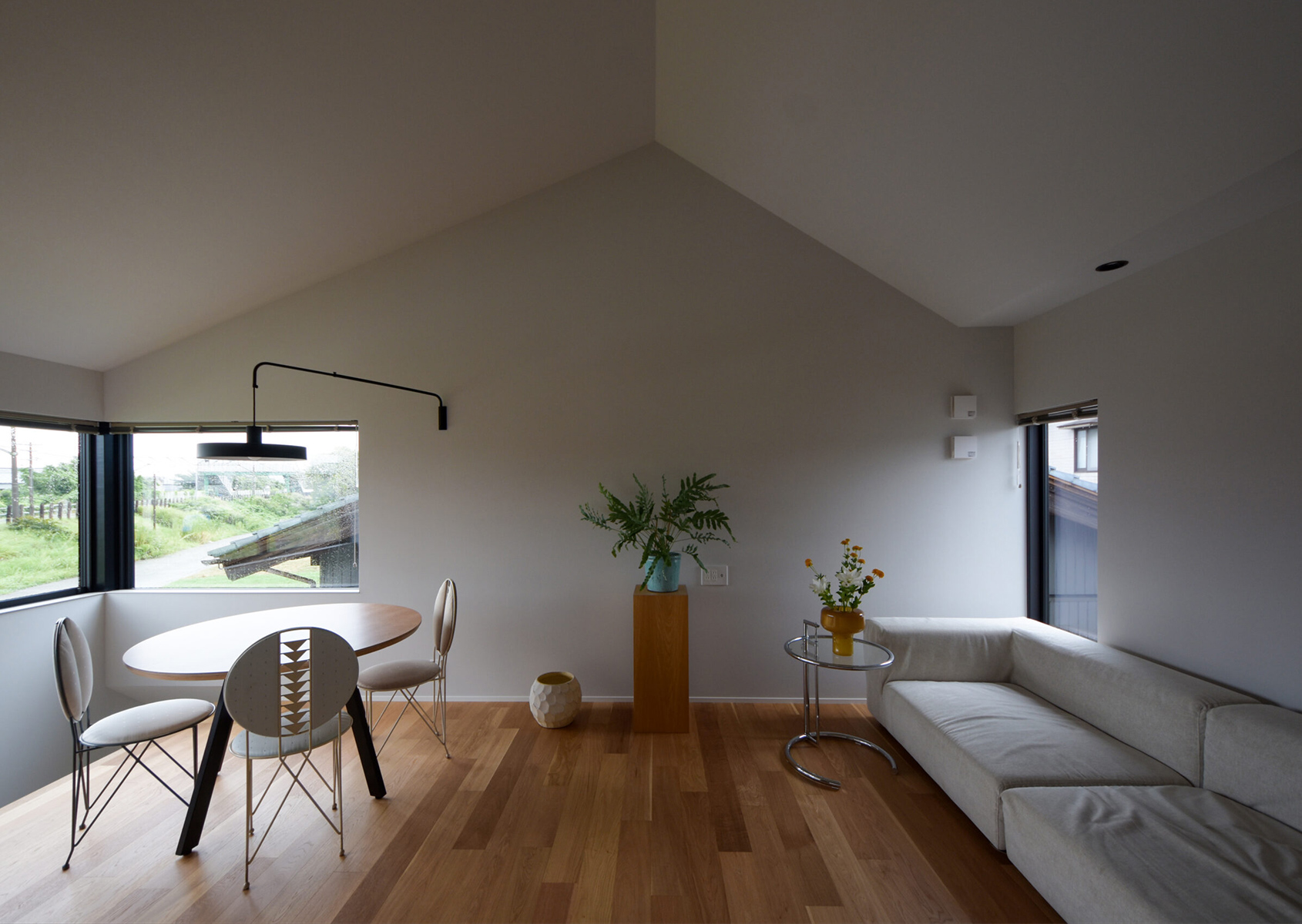 母屋とは行き来ができるようにし、母屋で空いた部屋を子供部屋として活用します。同居という形式の中で、ご夫婦のプライベートスペースを確保しつつ、お互いの生活を分かち合うことで、生活リズムを調整しながら助け合い、共存することを目指した住まいです。増築部は、1階に3台分のインナーガレージを、2階にはコンパクトなLDKと主寝室・水回りを設えました。コンパクトだからこそ、母屋でのおおらかな暮らしとの対比が生まれ、空間の広がりや居心地の良さをより強く感じられる住まいとなっています。