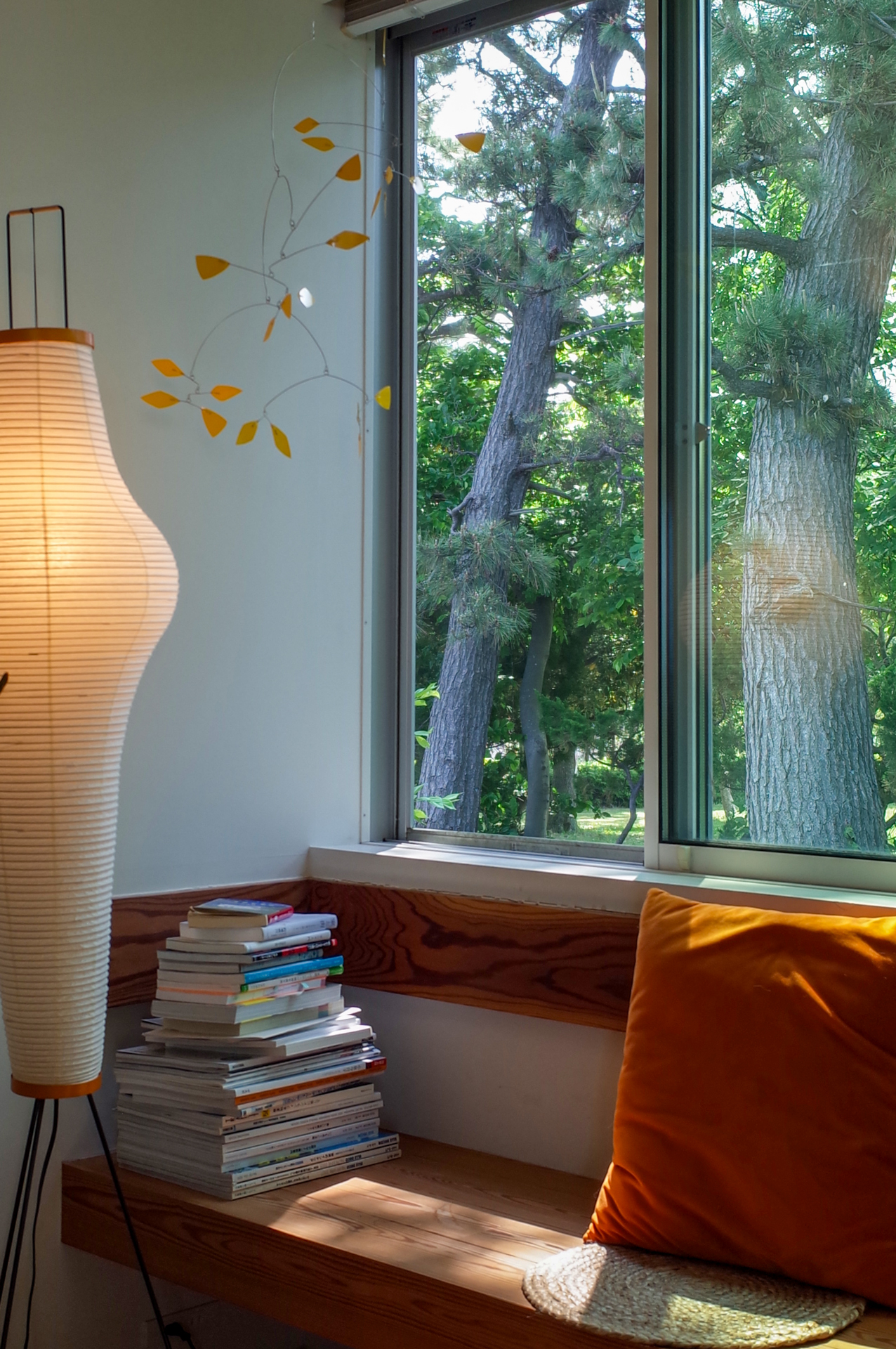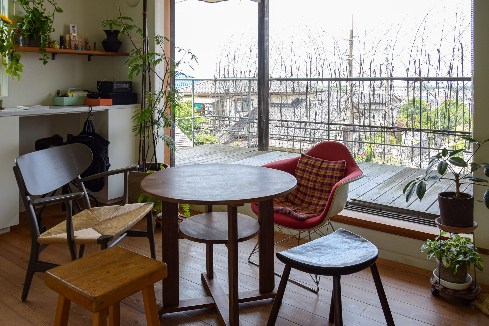 部屋にはシャルロット・ぺリアンのスツールなどの名作家具から、名前のないガラス細⼯まで、直感で選ばれたものが並ぶ。どの品にも物語があり、⼿に取るほどに愛らしさが深まっていくものだ。新築当初に迎え⼊れたアンティークのダイニングテーブルは、⼆⼈暮らしにちょうどいいサイズ感。やや低めの⾼さが、ラウンジチェアと⾃然に馴染むという。いつも座っているのはイームズのチェアと、ハンス・J・ウェグナーが⼿がけたCH22。特別に構えることなく、暮らしの延⻑として使い続けている。特にお気に⼊りのインテリアは⼤橋保隆さんのスタンドライト。⼤橋さんは⼀枚の平らな銅板を⾦鎚で打ち起こし形作る鎚起銅器の職⼈。何万回も打たれたであろうランプシェードは銅板の冷たさと職⼈の⼿の温もりを感じる独特な雰囲気だ。そうした家具や道具に共通しているのは、暮らしの中で静かに存在感を放ちながら、どれもが主張しすぎることなく、触れたとき、灯ったときに、感覚に静かに訴えかけてくる。 「この家に暮らし始めてからは、⾃然と同じリズムで暮らしています」。朝の光や⽉のあかり、部屋の間接光、猫のにおい、⿃のさえずり—そんな⼩さな気配に意識が向くようになった。⾃分の感覚を信じて建てた家は、⾃然と響き合いながら暮らすための静かな器になっている。