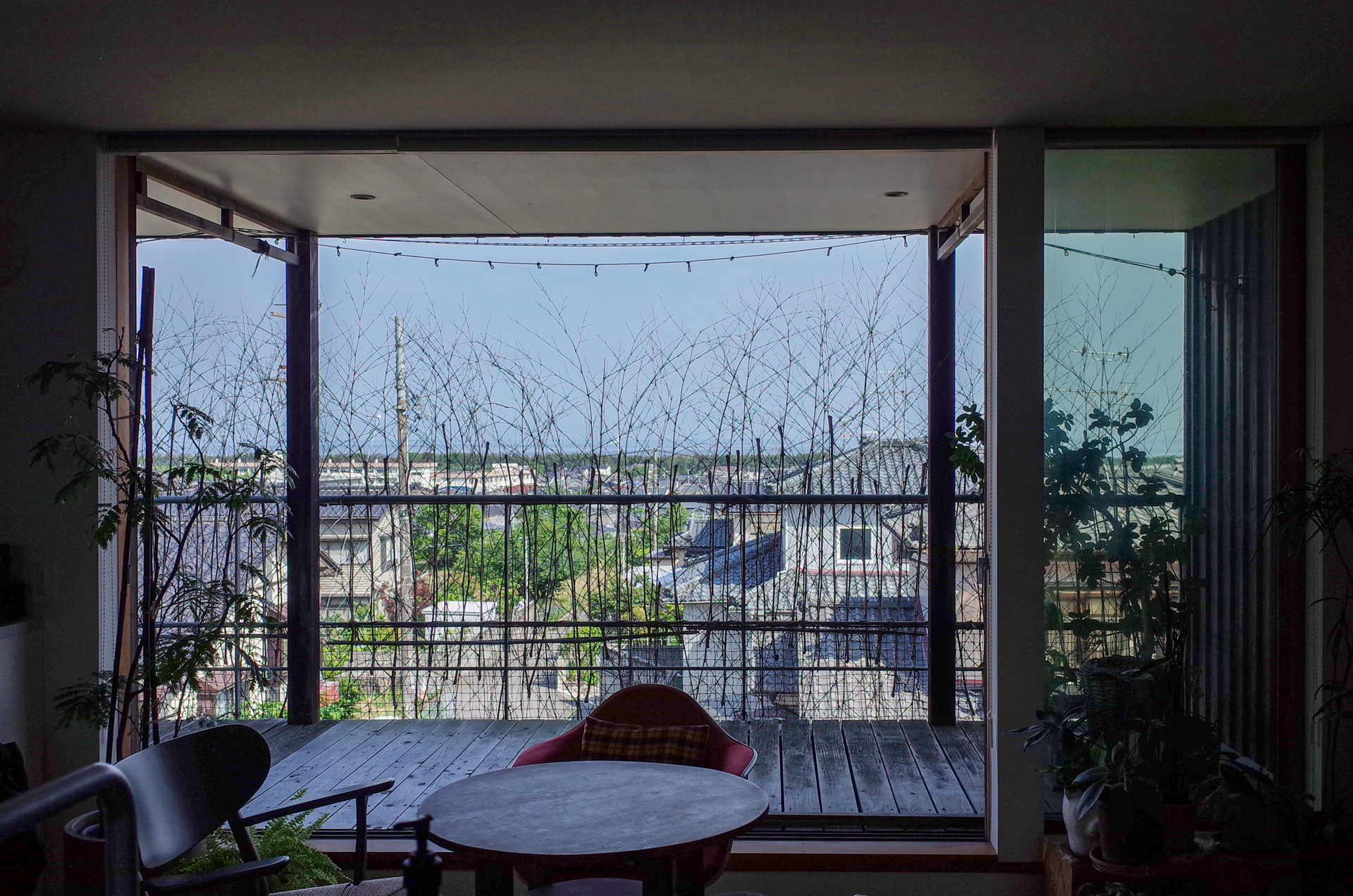 海が⾒える場所を探していた。 坂を上った先にあるこの⼟地は、街の向こうに海がのぞき、裏⼿の公園では⼤きな⽊々が⾵に揺れていた。葉擦れの⾳と⿃の声が混じり合うその静けさに、「ここなら理想の建物が実現する」と確信したという。⾒晴らしのよさと公園沿いという落ち着いた環境に惹かれ、この場所に家を建てることを決めた。朝は公園側の窓から差し込む⽊漏れ⽇の下でコーヒーを飲む。天井を低く抑えたLDK。⾃然と窓の外へと視線が導かれ、⾼台でありながら落ち着きのある空間をつくり出す。傾斜地という課題や、⾼台ゆえの⾼さの感覚に迷う場⾯もあったが、最後の決め⼿は「はじめに良いと感じた感覚」だった。海と公園の⽊々をのぞむこの家と、部屋に置かれた⾃由な表情を持つ家具や⼩物。どちらも、施主の⼦供時代から続く感覚の延⻑線上にある。