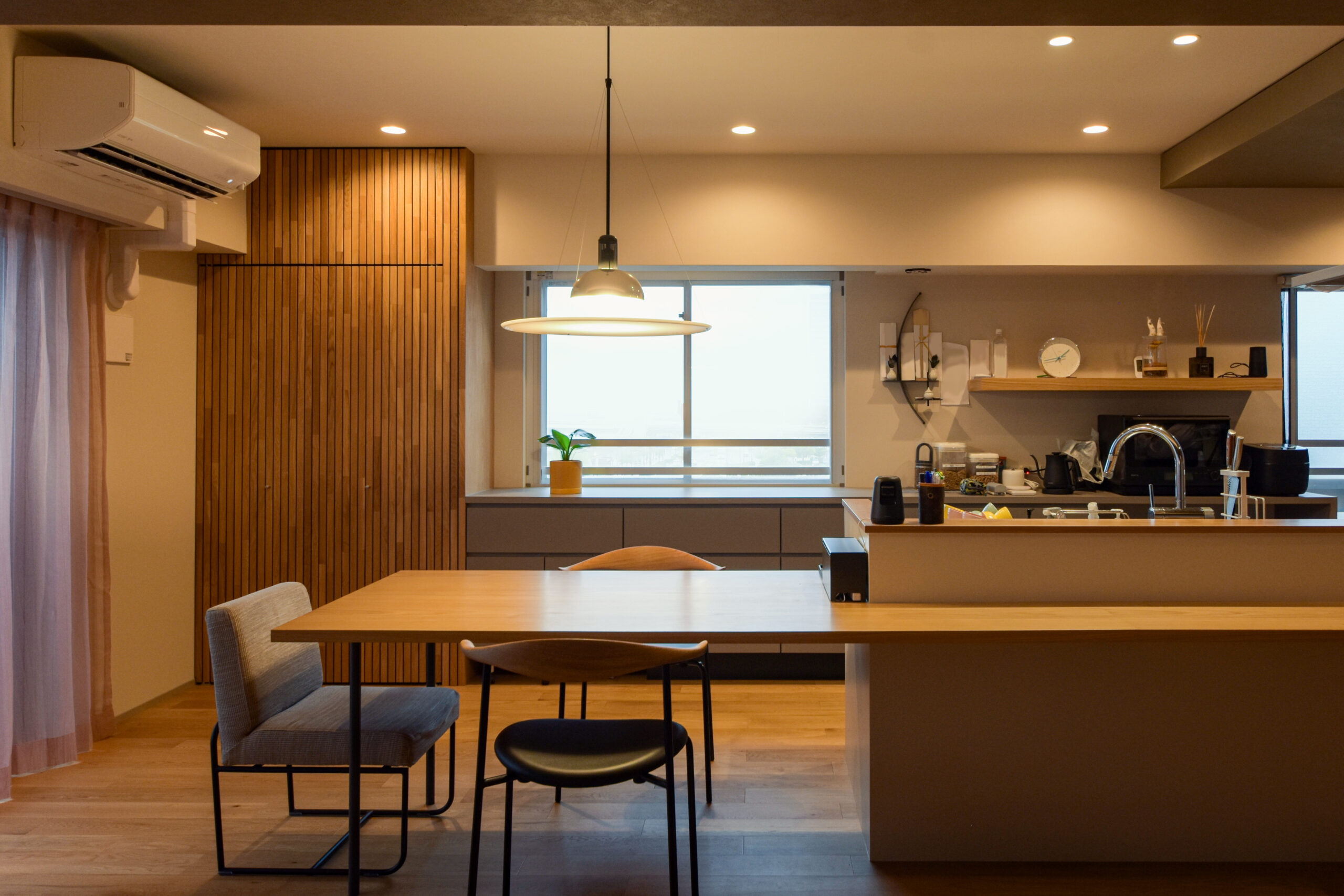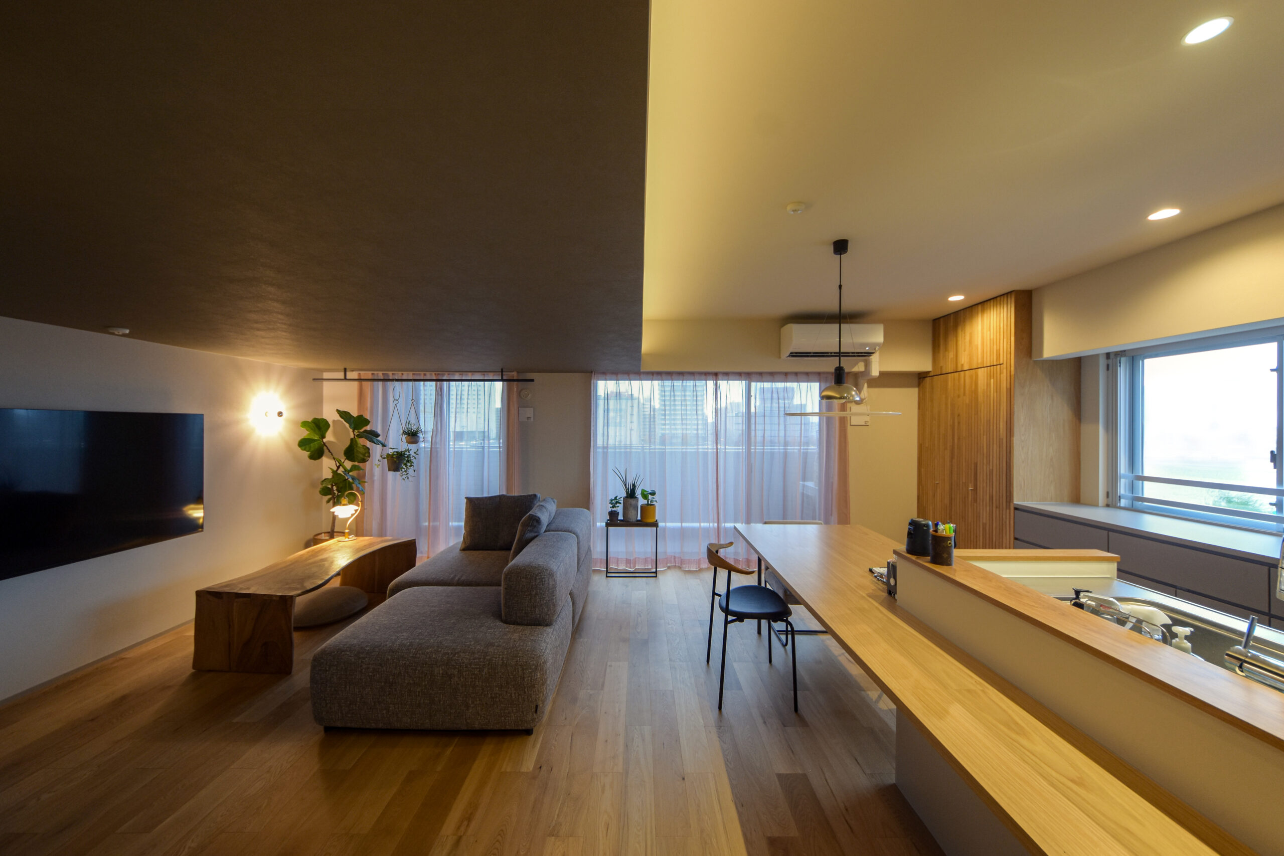 そこで今回の計画では、敷地条件からプランを考え、LDKの南側に中庭を設けることで、住宅に囲まれた環境でも光と風が十分に届く空間をご提案しました。対面キッチンとI型のLDKのご要望があったため、天井高に変化をつけることで、広がりを感じながらも単調にならない空間構成としています。
