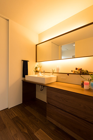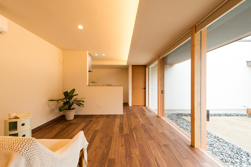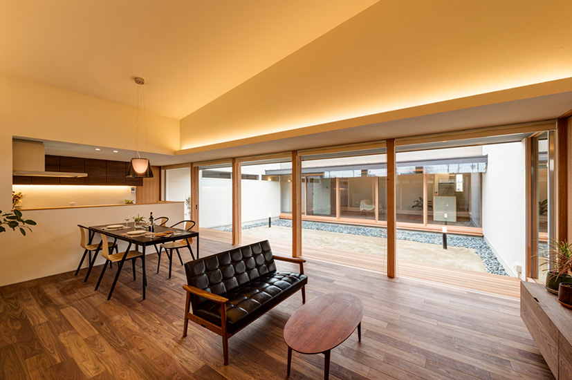 車通りの多い道路の喧騒を遮断し、二世帯双方に対して明るく豊かな居住空間を目指した。 計画は、広い敷地に対して伸びやかな平屋とし、中心に共有部分となる中庭を置き、LDKを向かい合うように配置した。 家族の気配を感じるLDKは、そこに住む家族が、自然に交じり合い、生活することで繋がりを深めていく。 「平屋の二世帯住宅」は、大きな中庭によって、多彩で豊かな居住空間となった。