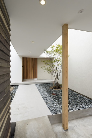 アプローチからは前庭の緑が望め敷地奥への期待感を高め、またリラックスできるプライベート空間への心の移り変わりを演出する。