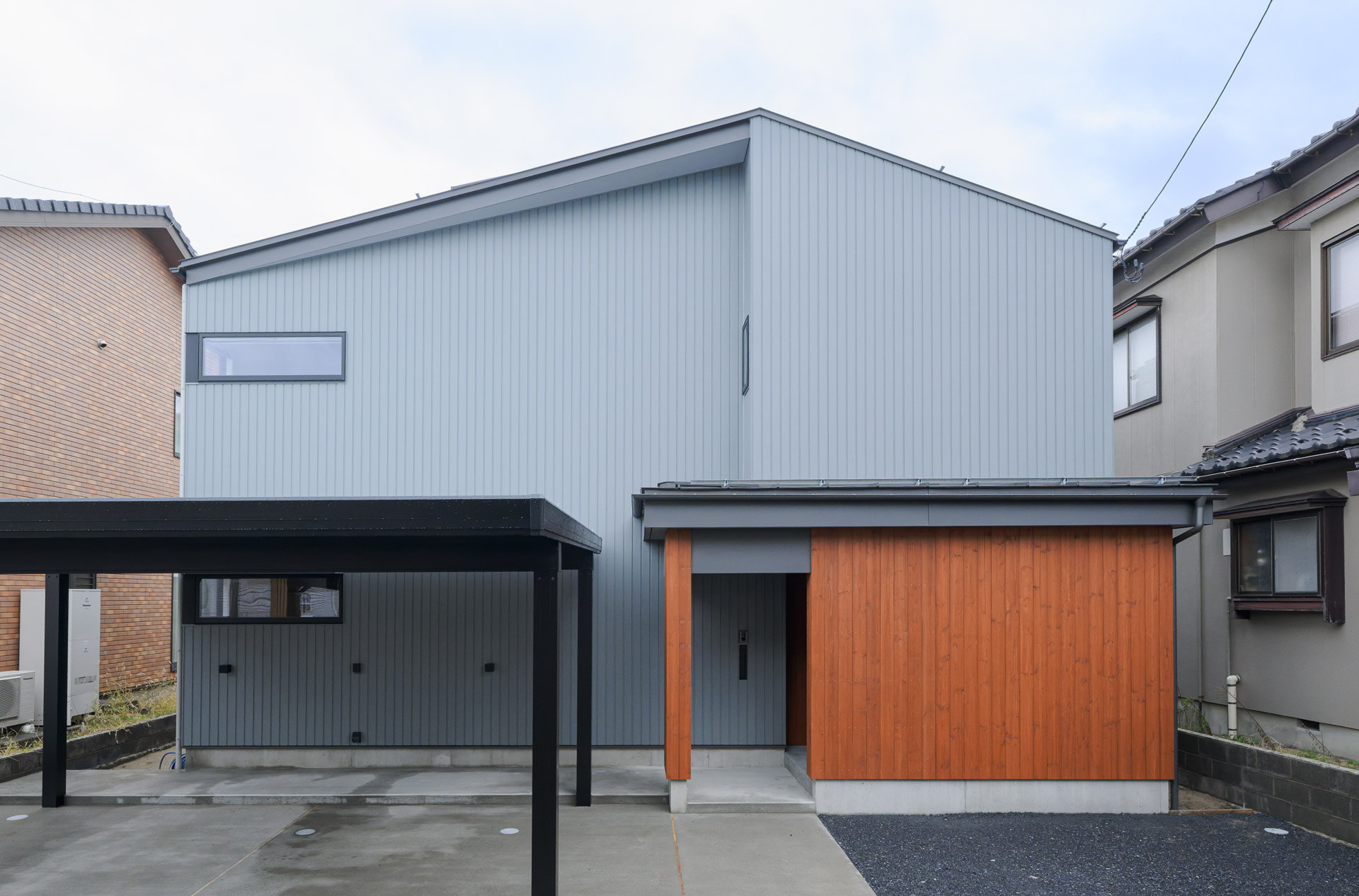 外観は、切妻屋根と下屋を組み合わせ、重心を低く見せながら横に広がる印象に。小路を進むと、軒先から棟に向かって屋根を張り出す構成とし、奥行きを感じられるデザインとしました。アプローチは木製の外壁材を採用し、玄関ポーチ脇の外部収納は木製の造作扉で統一。ご主人の趣味であるアウトドア用品をゆったりと収納できるスペースとしています。