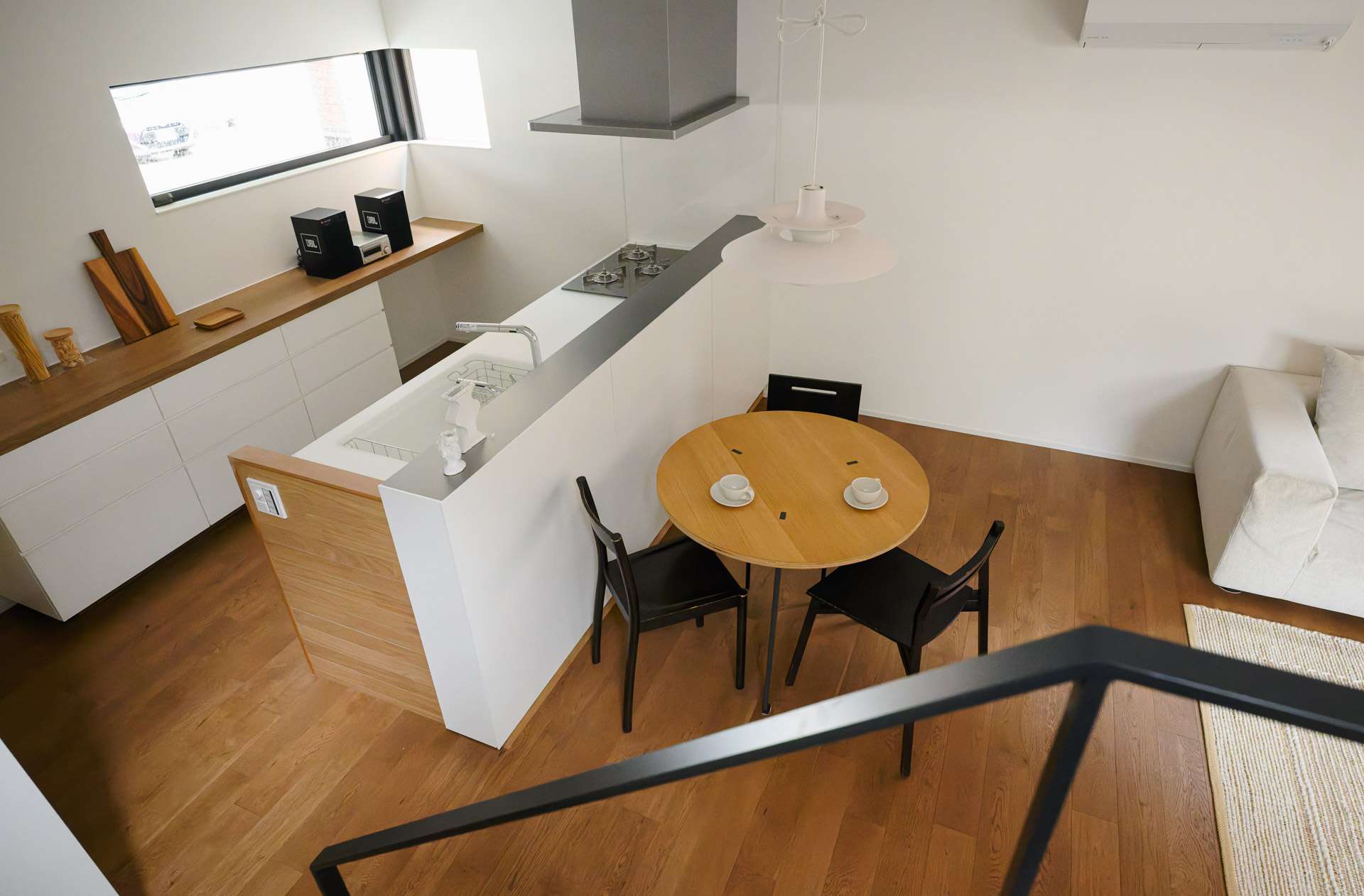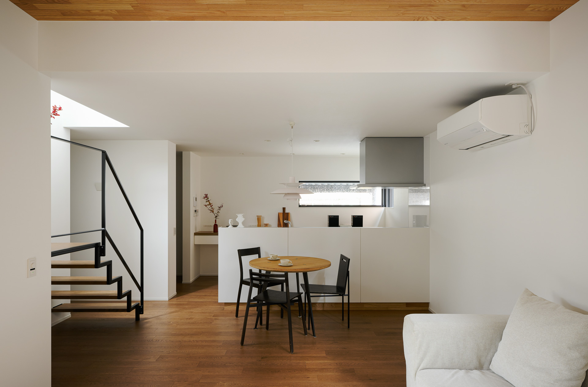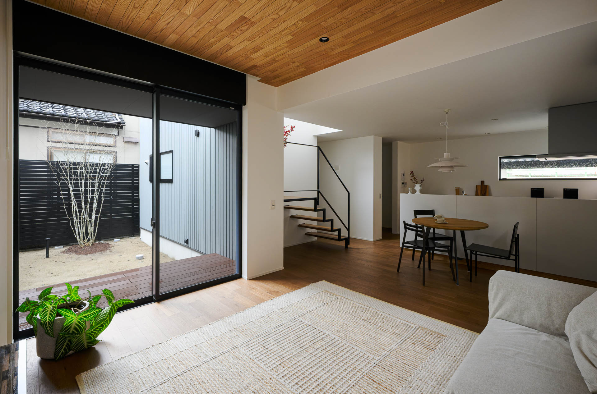 そこで今回の計画では、敷地条件からプランを考え、LDKの南側に中庭を設けることで、住宅に囲まれた環境でも光と風が十分に届く空間をご提案しました。対面キッチンとI型のLDKのご要望があったため、天井高に変化をつけることで、広がりを感じながらも単調にならない空間構成としています。